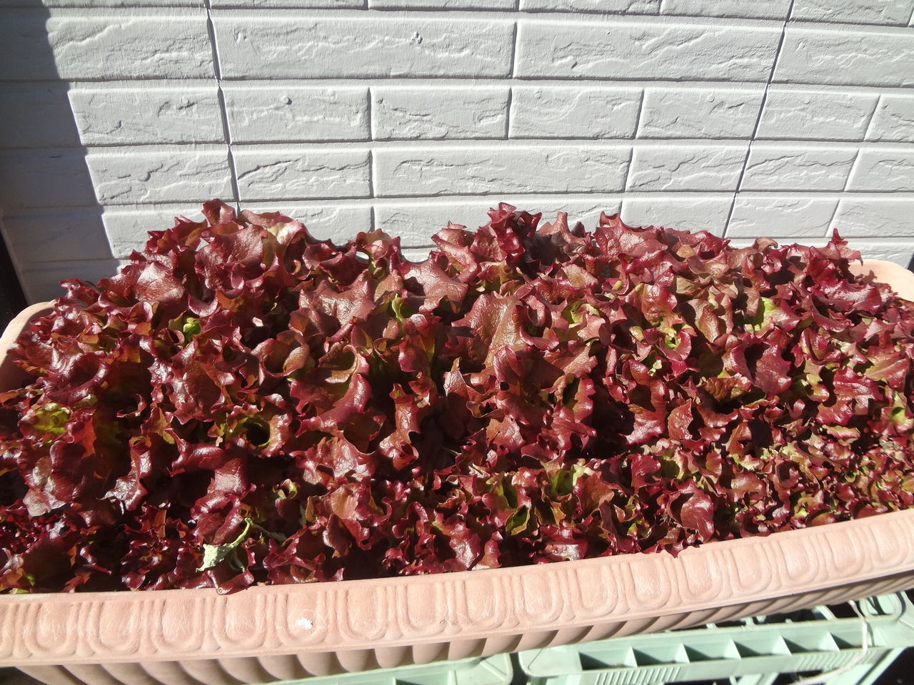 Cyber-shot WX70プランターのリーフレタス、手前一列はヒヨドリが食べていたので成長が遅れました。3月27日撮影。