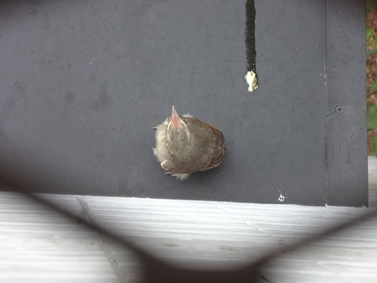 ヒヨドリの雛。鳴き声はピーピーとか細い声で、ずつと親を呼んでいます。2日後、4m飛べました。しかし、まだ天敵から逃れるだけの力はありません。