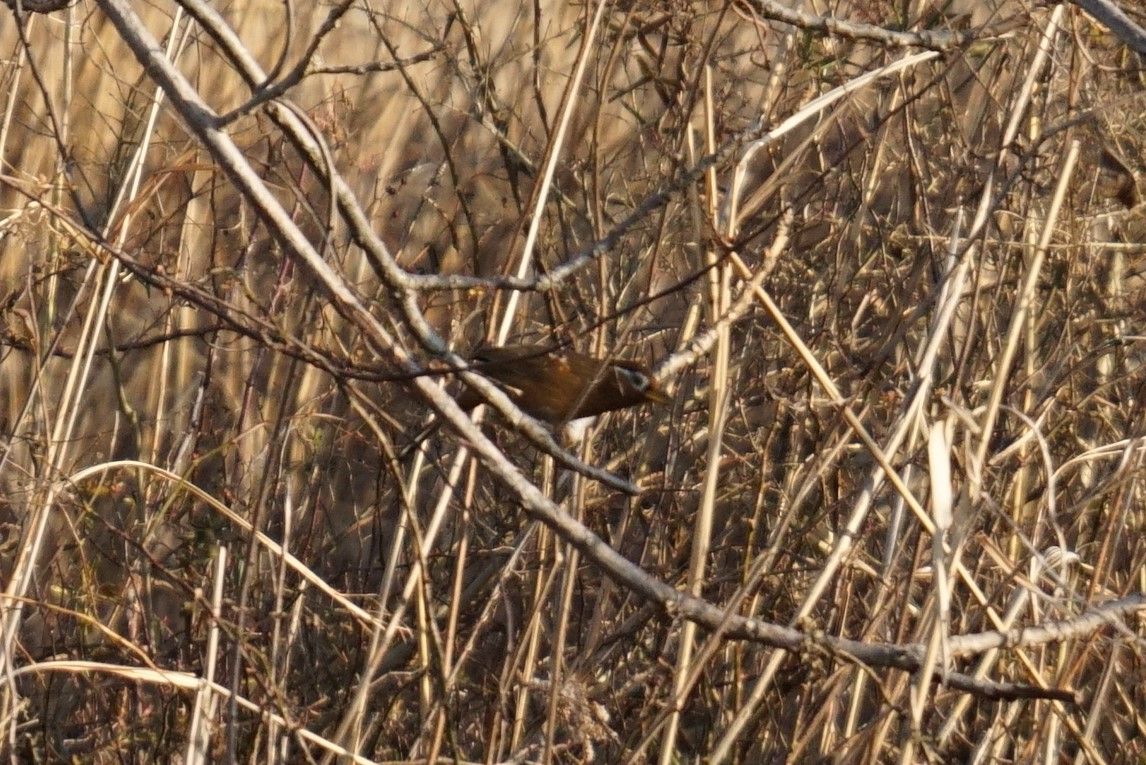 冬は渡り鳥がたくさん見られます。特に水辺にはカモ類がいっぱいいます。鳥の図鑑を買ったばかりだったので、ワクワクしながら渡り鳥を見に川に行きました。橋から眺めると、岸辺の葦の辺りにはたくさんのカモたちがいました。更に葦原に近づいてみると、繁みで百舌同士の争う声が聞こえました。見てみると、雌の百舌と峨眉鳥(ガビチョウ)でした。