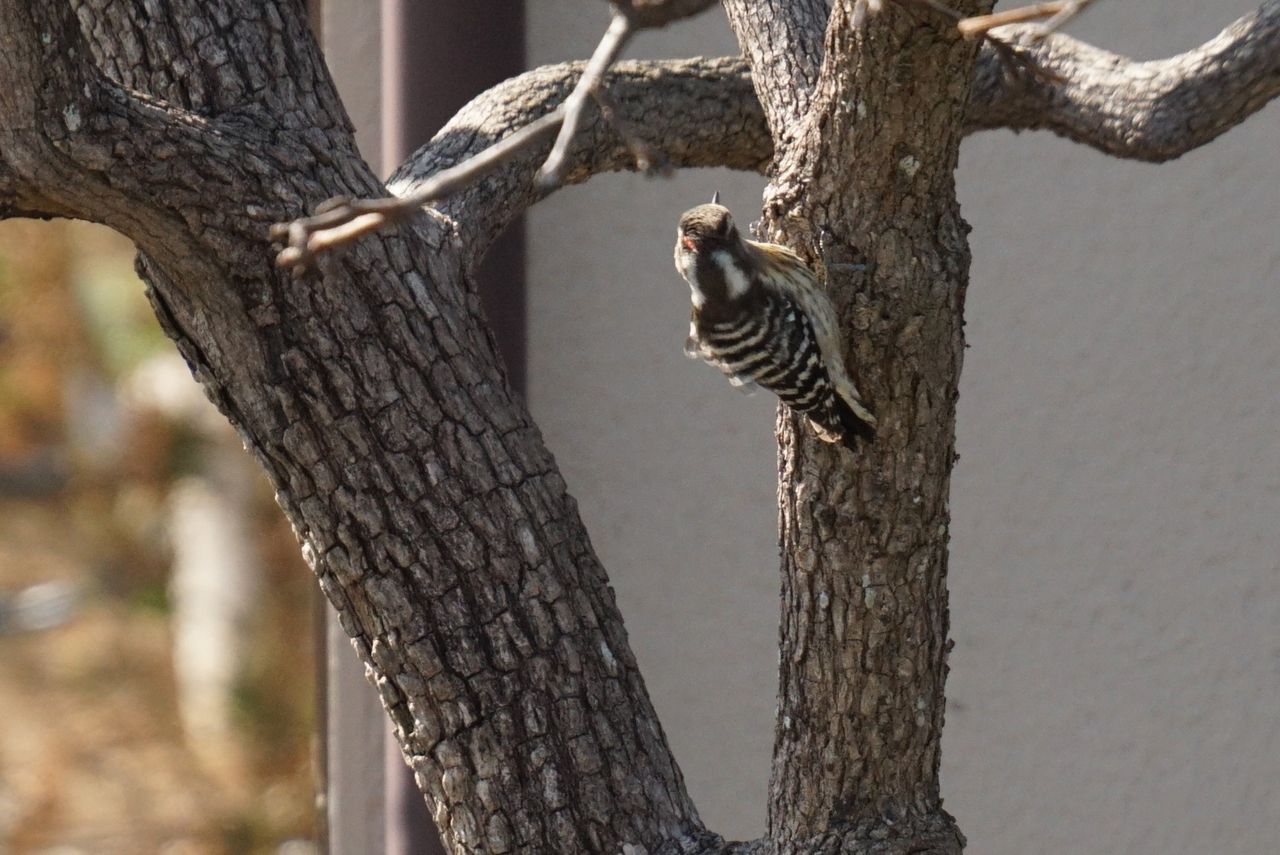 コゲラは木の下から上へと昇りながら餌を探します。ちょこまかと動き回るコゲラは取るのが難しいです。目白やスズメは、カメラを向けると警戒して飛んで行ってしまいますが、コゲラは我関せずといった風に見えます。一心に餌探しをしています。
