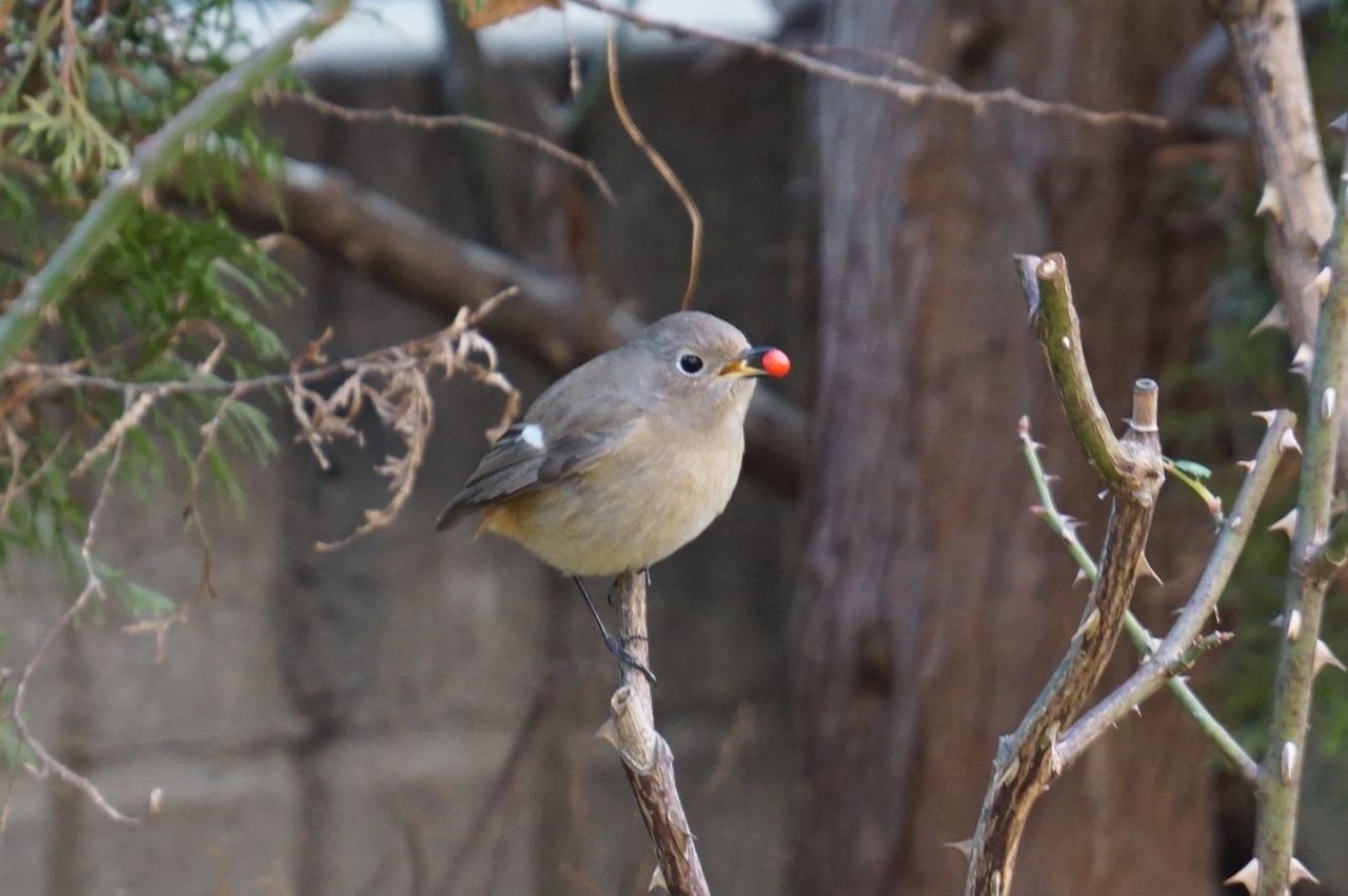 ジョウビタキは10月の中頃に、北から渡ってくる渡り鳥です。冬の間は単独で行動しています。同じ場所で、ジョウビタキが何羽も群れているところは見たことがありません。ジョウビタキは、毎年同じ個体が前年に築いた縄張りに来ています。そして必ず毎日餌場を回ってちょっとずつ木の実や虫などを食べています。