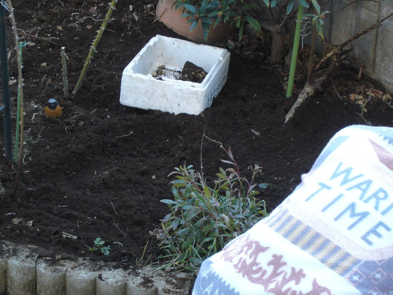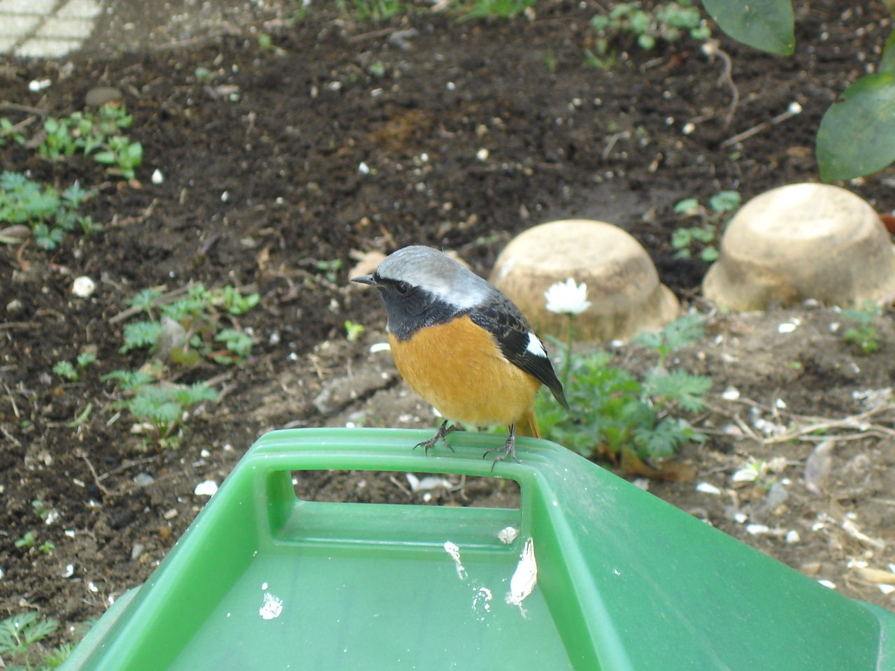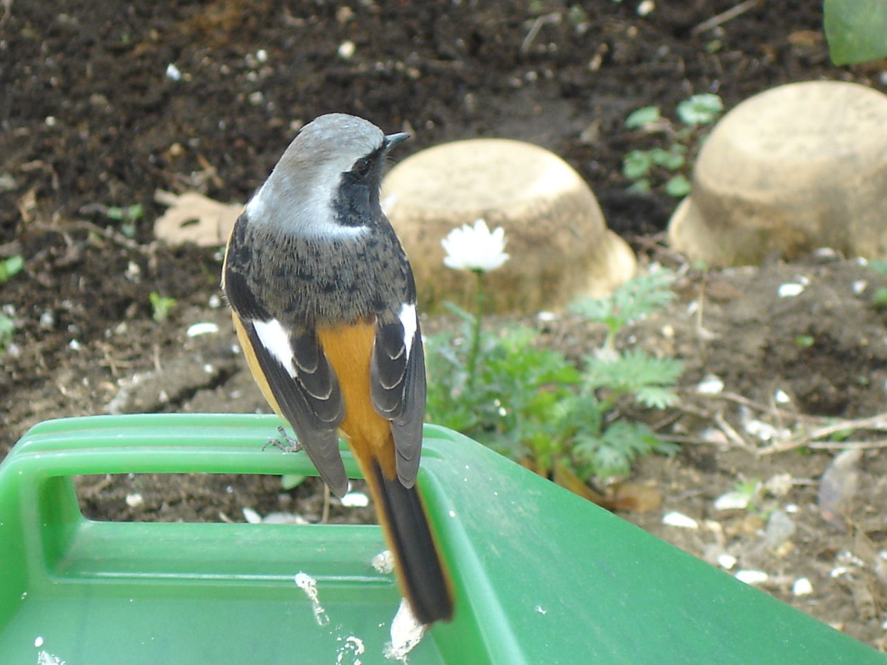 するとジョウビタキのジョー君がやってきてそばで作業を見ていました。ジョー君は4年ほど前から我が家にやって来て、よく、庭で私の作業を見ていました。