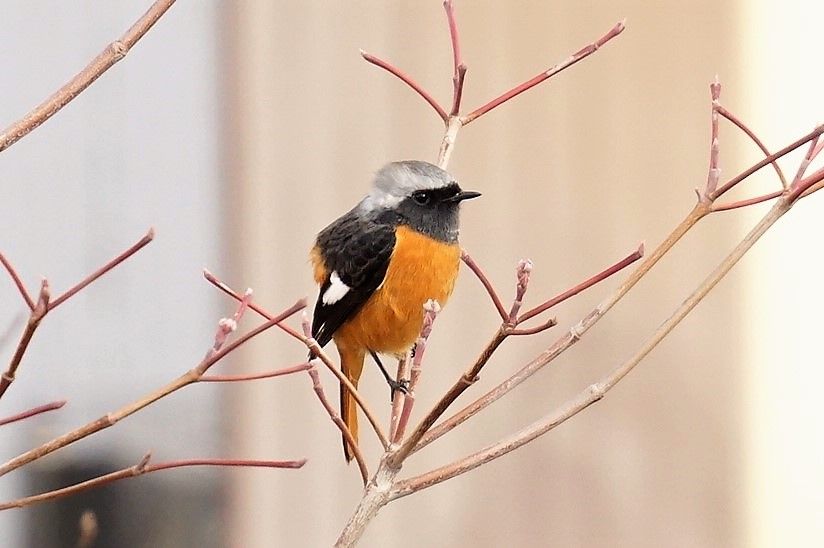 雄は、頭が青味を帯びた灰色頬が黒く胸から腹にかけてオレンジ色をしています。羽から尾にかけて黒く、風切り羽の根元が白くなっています。腰のあたりにもオレンジの毛があります。