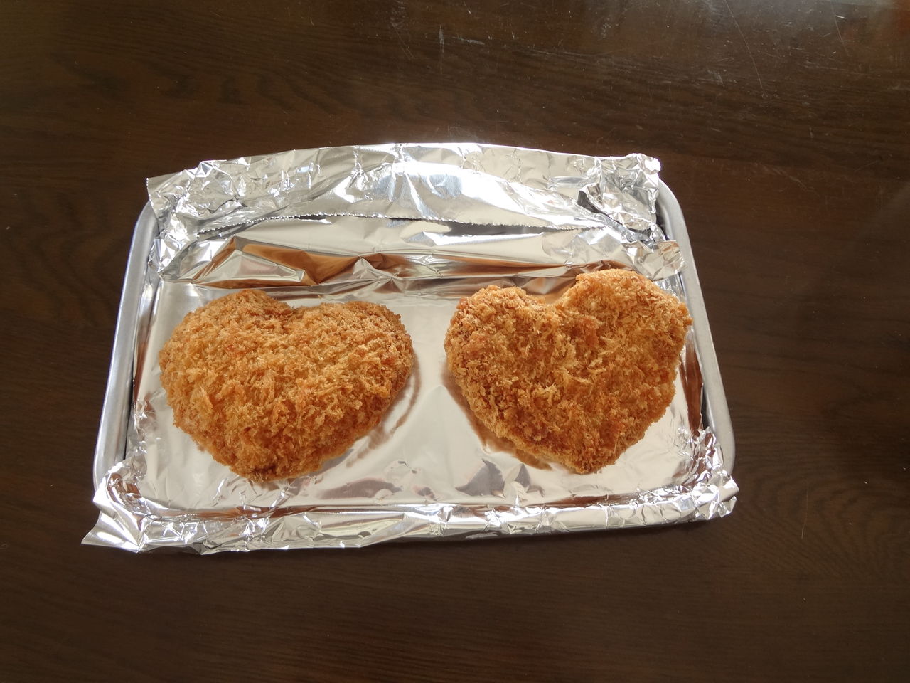アルミホイルを敷いたトレイに揚げ物をのせ2分余熱をした後に揚げ物をのせたトレイを入れ2分そのままで保温をし、後に3分温め更に2分置きます。その後裏に返して3分焼き2分置きます。中まで温まった状態です。