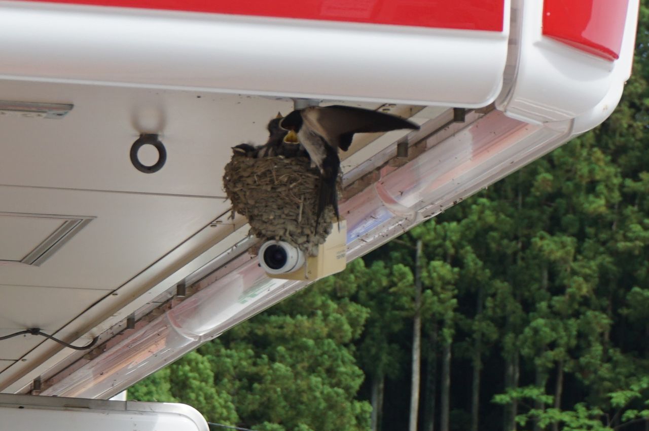 全面が開けたコンビニエンスストアの防犯カメラに巣をつくるツバメ。