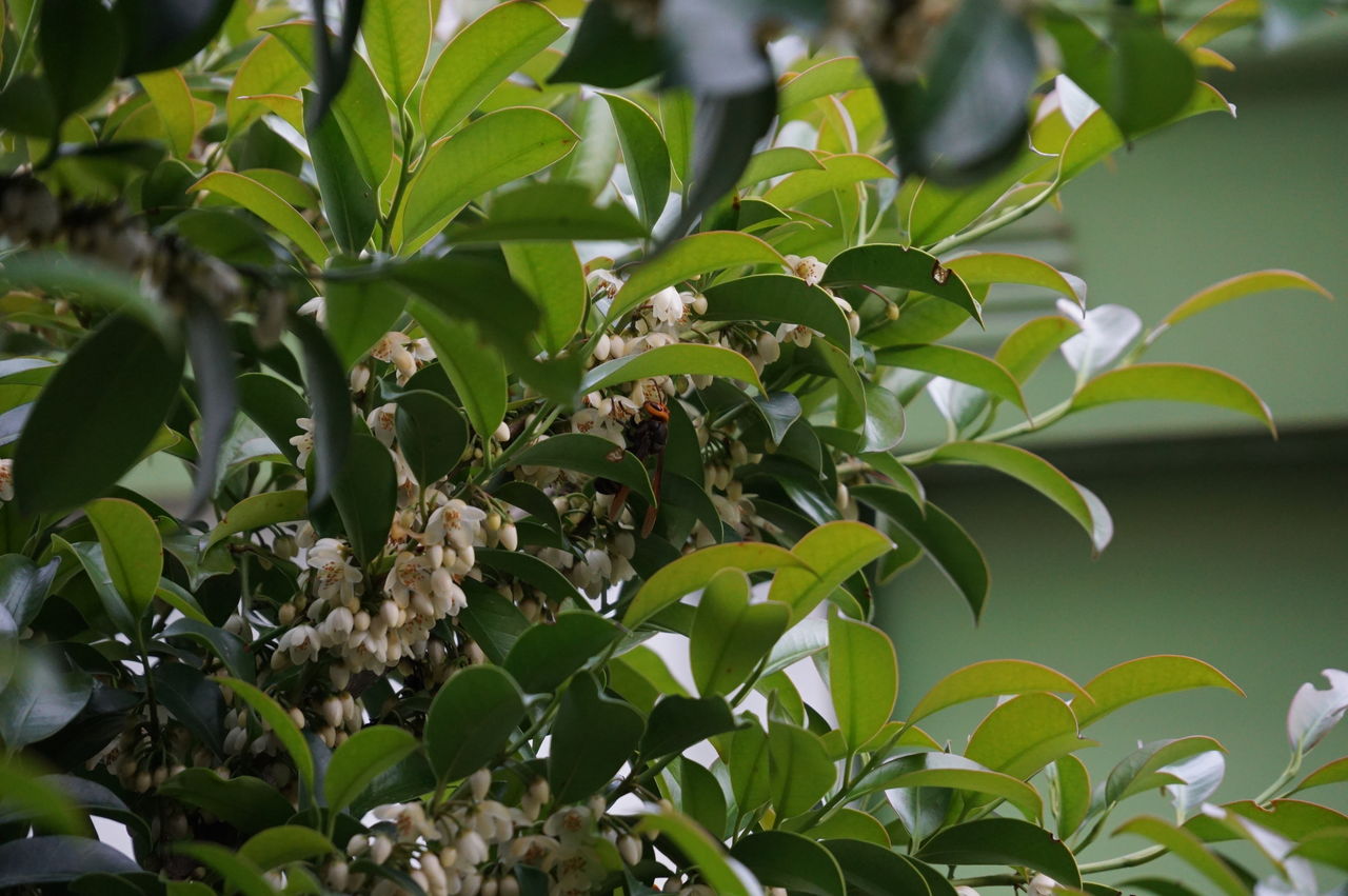 花の蜜を吸いに来たオオスズメバチです。オオスズメバチは蕾の頃に何回か偵察に来ました。心待ちにしていることがわかります。その他ミツバチやシジミチョウ、アシナガバチなども来ます。花の時期、サカキのそばにいると特にクマバチが威嚇して頭の周りを羽音を立てて飛びます。かなりの迫力です。