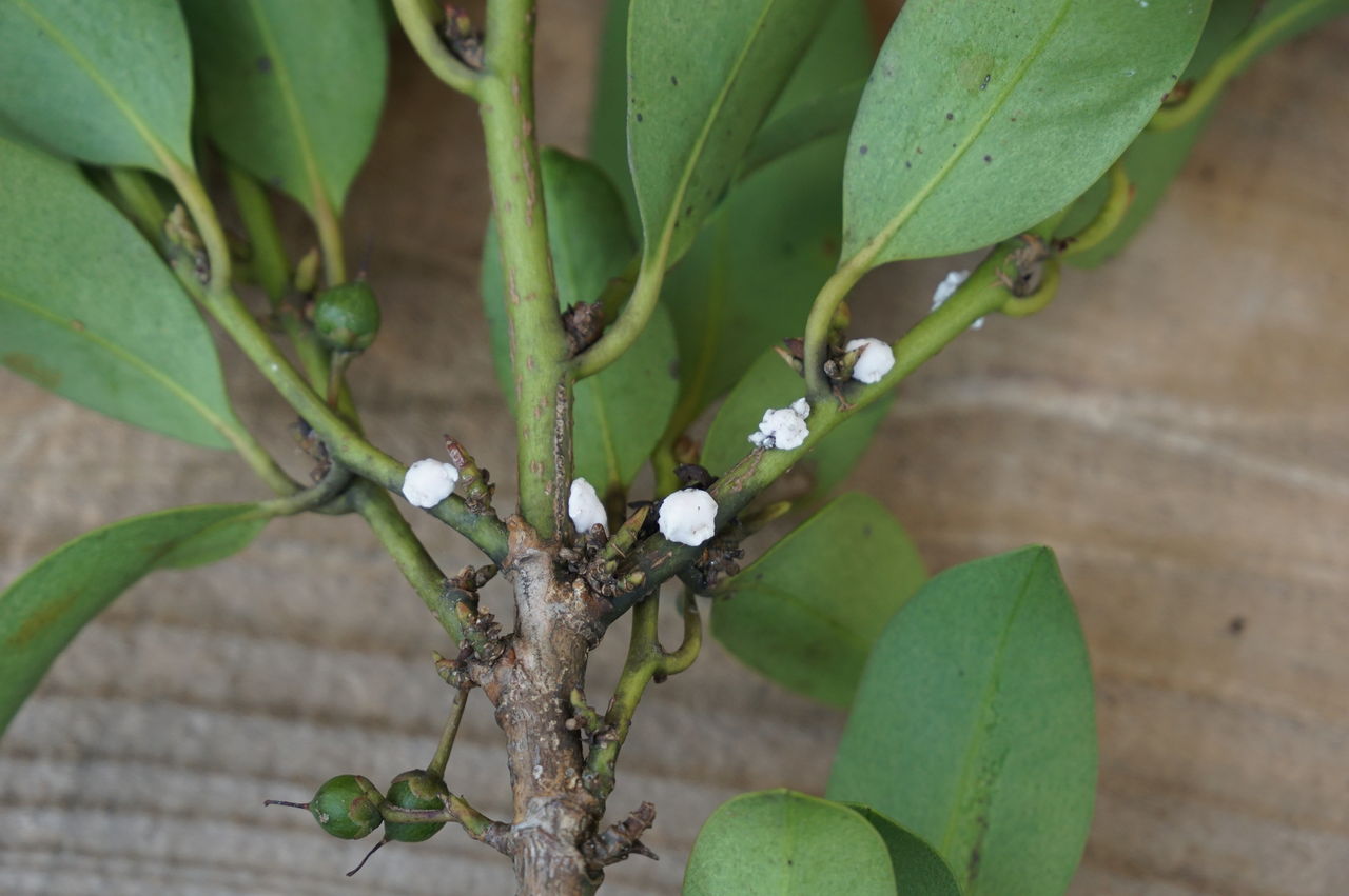 木の汁を吸うカイガラムシの一種、ロウムシが付きます。幼虫の時は歩き回りますが、白い蝋の様な鎧におおわれるとじっとして植物の汁を吸います。農薬は効かなくなります。ヘラなどでこそぎ落とします。