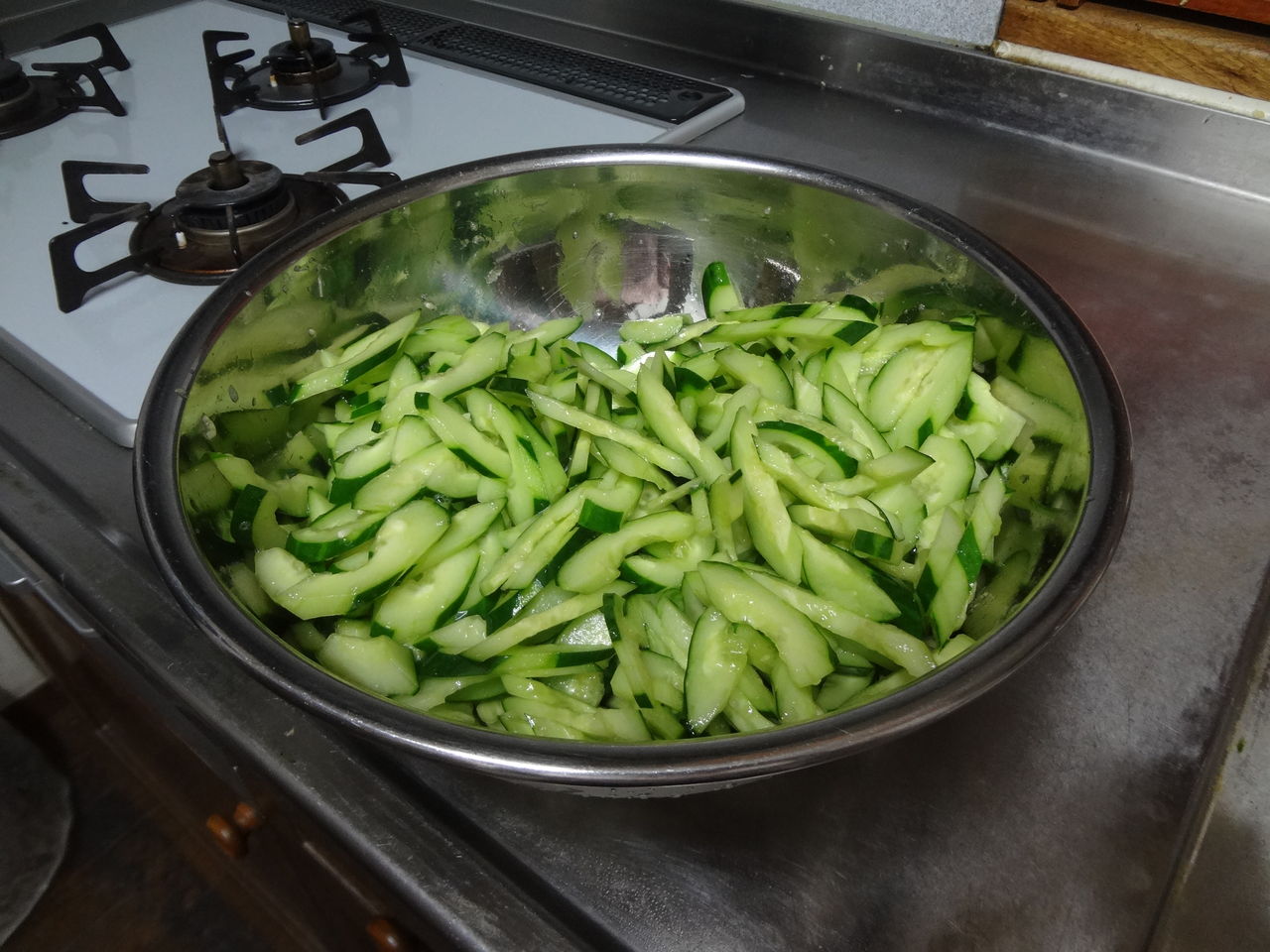 きゅうりは皮が固くなっているので、縦に3か所くらい皮をむいて中の種を取り、厚さ2ミリくらいに刻み、塩をまぶし軽く揉みました。