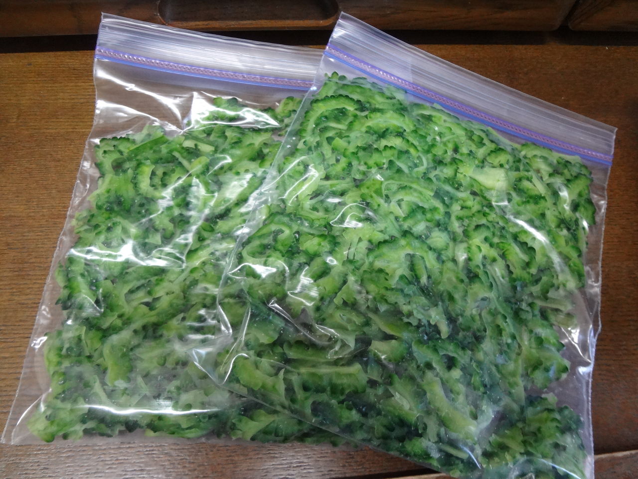 ニガウリは、本の通りに切り冷凍した物は、かなり苦みがありました。それで、自分流に冷凍してみることにいたしました。薄くスライスして塩を振り、揉んで水けを出した後しっかり絞ってジップロックに入れ冷凍します。