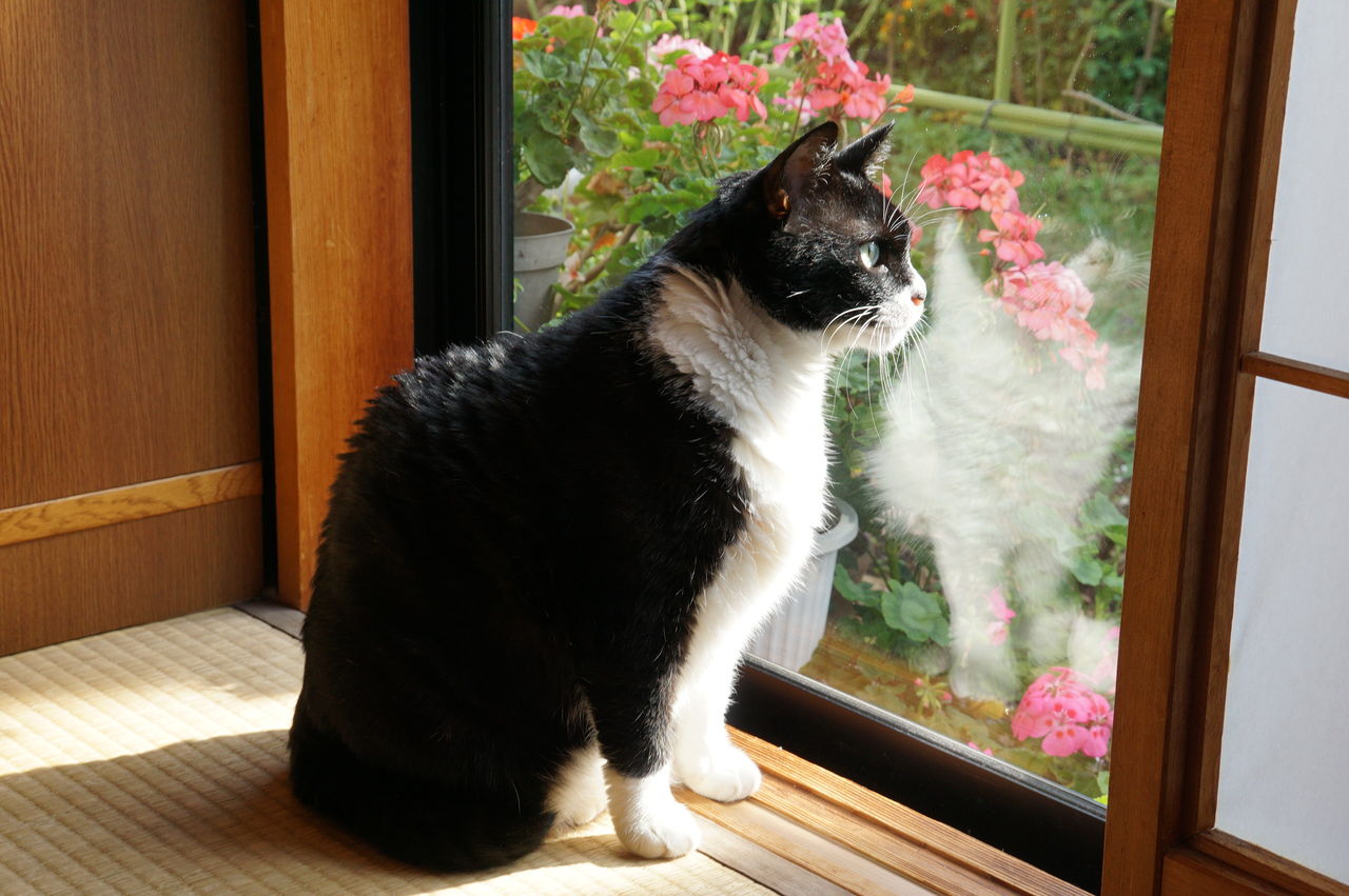 障子を開けるのが面倒になると紙を破いて首だけ出して外を見ます。それで今は、ソラの体分左右に20cmくらい、あるいは座布団を置いて外が見られるよう障子を開けています。