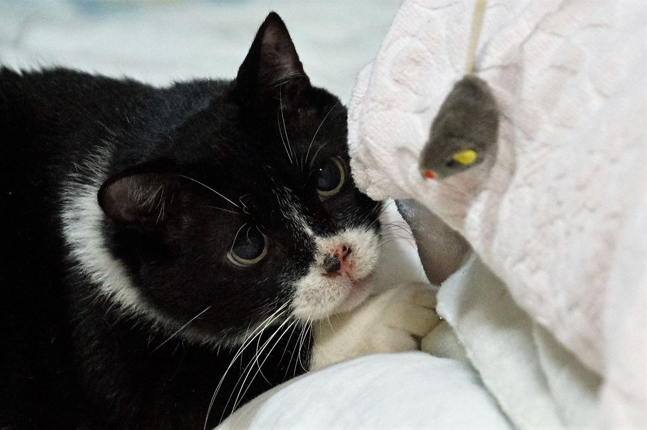 sony a6000 photo by Yasunosukeyおもちゃのネズミで遊ぶソラ。ネズミのおもちゃは小さいので、飲み込み防止に紐で縛っています。