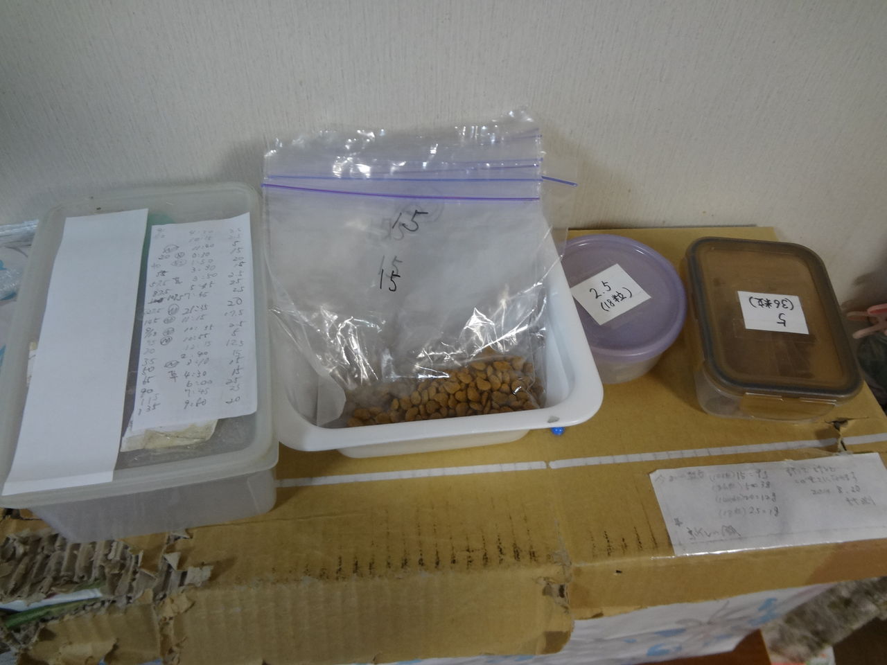 Cyber-shot WX70ソラのご飯。一番左側は、ご飯をあげた時間と量をメモしておく紙。タッパーには今までのご飯が入っていて、新しいごはんと混ぜてあげています。