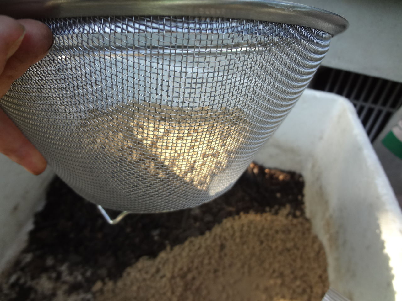 赤玉土小粒を使いますが、微塵が入っている場合は、要らなくなった台所用ざるなどで軽く振るいます。すると上の方に粗い粒が集まるので、それを使うといいです。