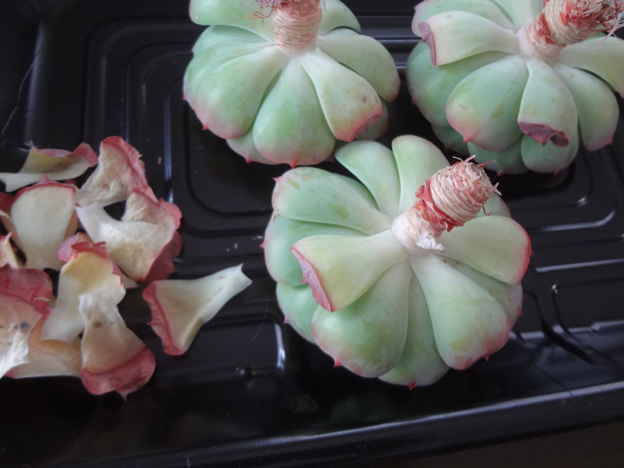 3、用土は、赤玉土、腐葉土、多肉植物用土を等量に混ぜた物。切り口が出るように浅く植えます。ウオータースペースはさほどいりません。