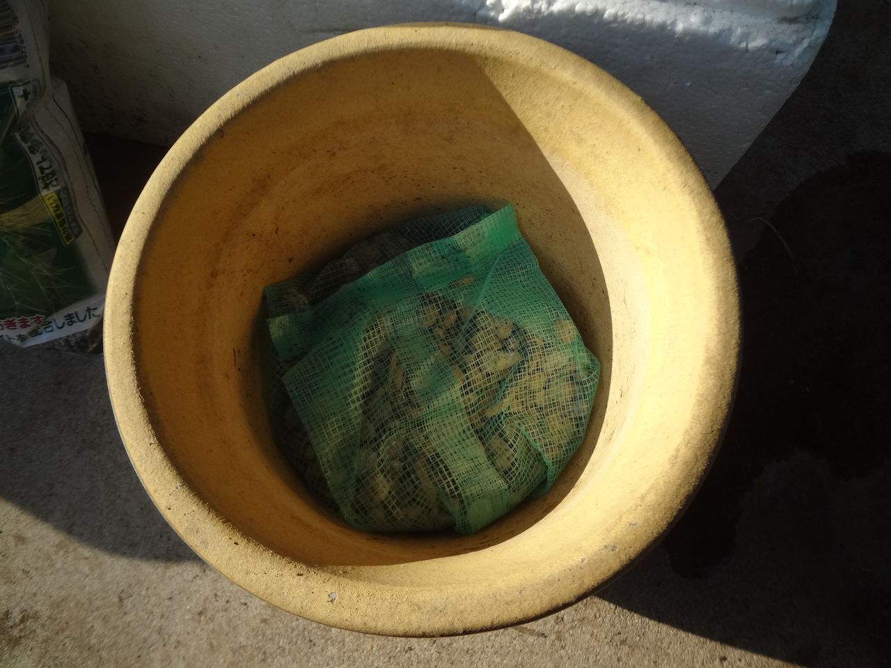 1、鉢の底に水はけを良くするため軽石を入れます。台所の排水ネットなどに入れると、植え替えの時、用土を分けやすくなります。