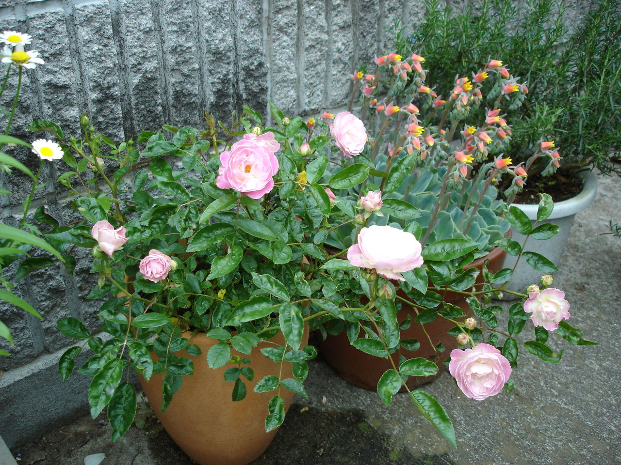 バラの隣でたくさんの花を咲かせるエケベリア。バラはスイートマザー。