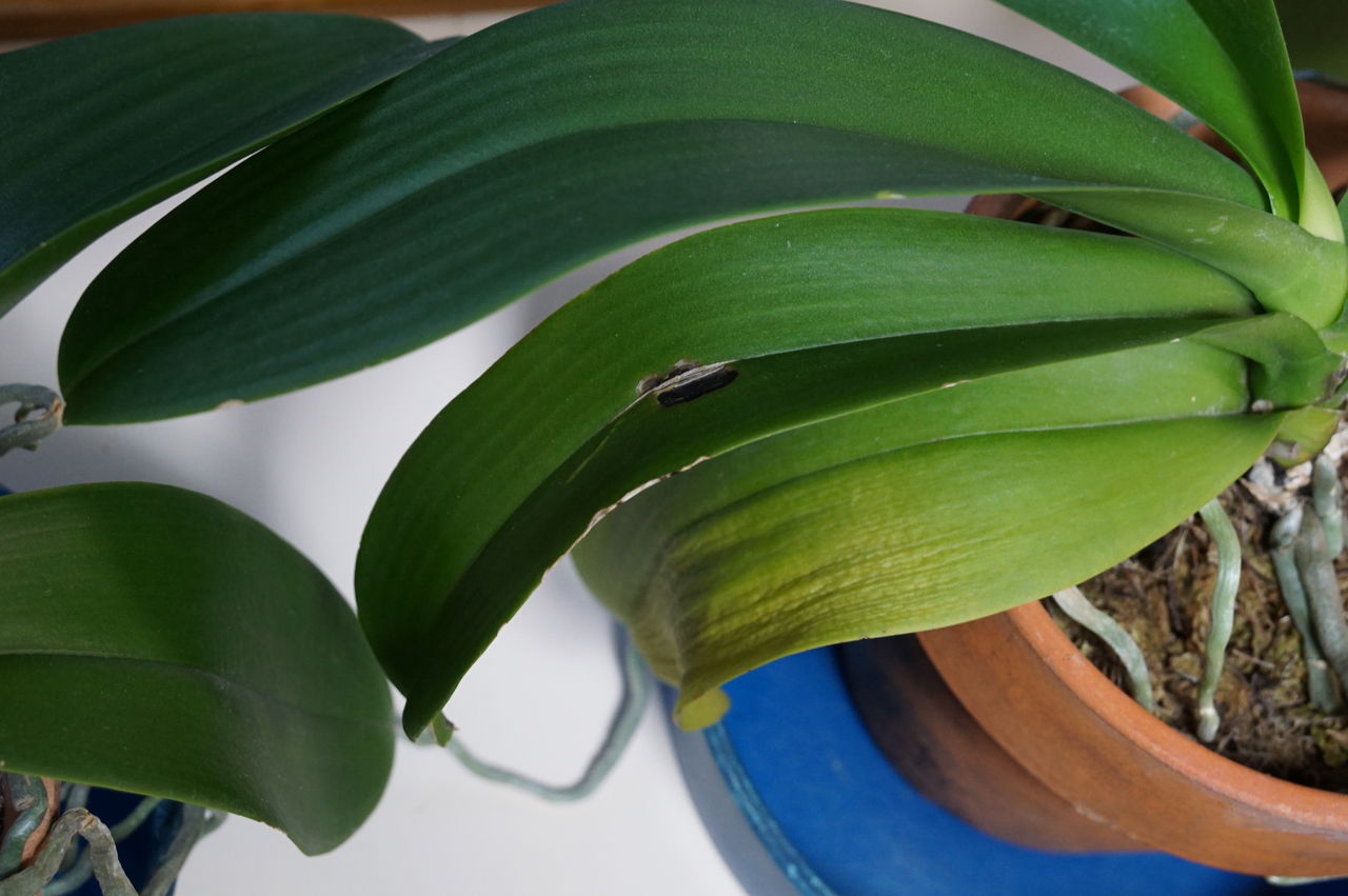 その時は、株全体を20℃から25℃の水で洗うように水遣りします。その後玉の様な水滴は拭き取ります。すると2日くらいで半分くらい回復します。新しい葉は回復が早いですが、古い葉は時々そのまま枯れてしまうこともあります。しかし株そのものは生きていますので、暖かくなったらしっかりと肥料と水をやります。濡れた柔らかい布でマメに拭くのも有効ですので、見つけ次第フキフキします。