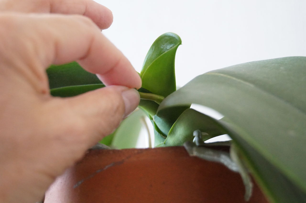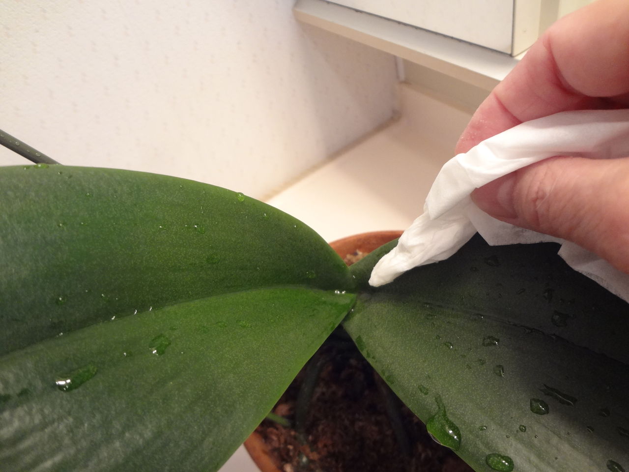 葉の中心にたまった水を拭きとるようにします。葉の中心に水がたまっていると株が腐る時があります。