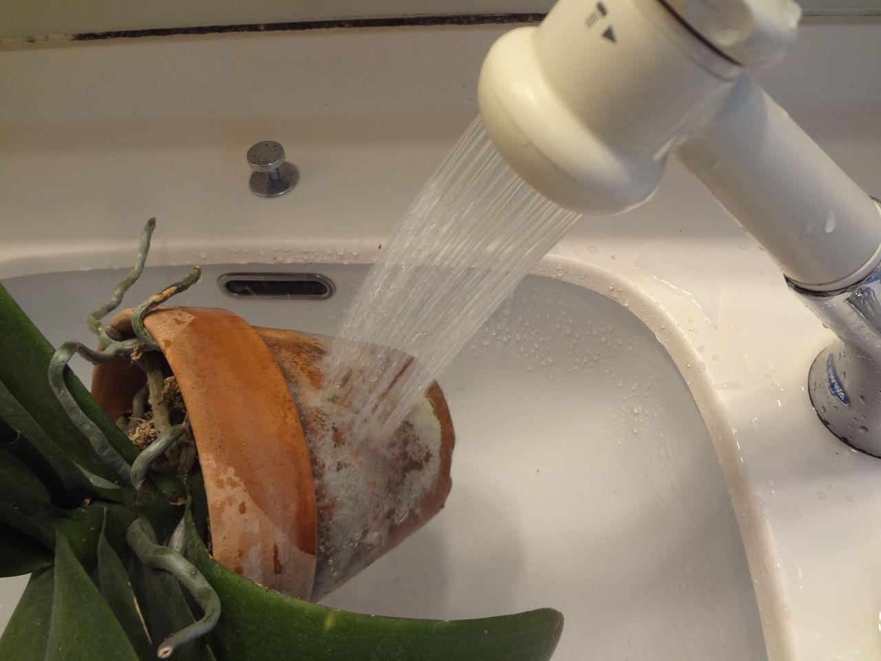 冬の間は暖かい室内で育てますが、一番気になるのは、鉢に付いたカビです。私は、月に2回くらいの水遣りの時に、20~25℃の水道水で、たわしでこすりながら落としています。