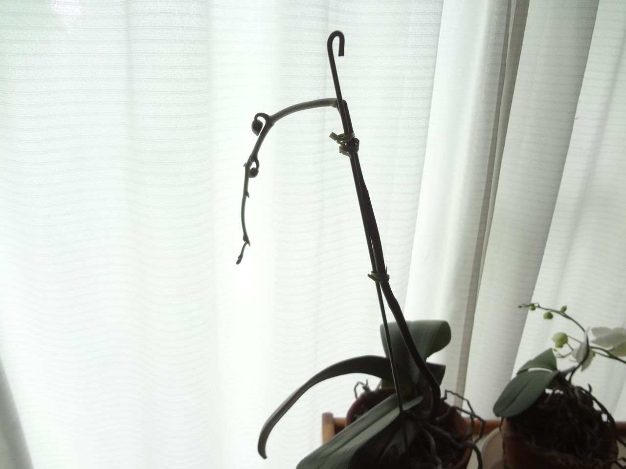 花茎をお店で売ってっているように曲げられない・・・花茎は、柔らかい時期があっという間に過ぎます。固くなると折ってしまうので、花茎が成長し始めたら、支柱を立てそれに沿わせるように曲げていきます。プロのようにはなかなかいきません。無理に曲げると曲げた近くの花に栄養がいかなくなって枯れることもあります。