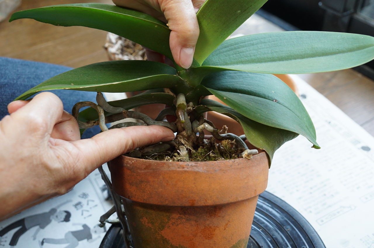 2018年8月26日、ミズゴケはほんの少ししか入っていませんが、根はこんなにたくさん出て元気いっぱいです。5号鉢が手に入ったら植え替えするつもりです。植え替えの手順は、中の発泡スチロールを抜き、古いミズゴケをすべて外し、新しいミズゴケを丸めて根の下に入れ、外側をミズゴケで巻き、新しい鉢に植え替ます。こちらは植え替えしてもアップは致しません。植え替えの手順は、上のミズゴケが古くなった株と同じです。茎が育ちすぎていたら少し切り詰めて株姿を整えます。