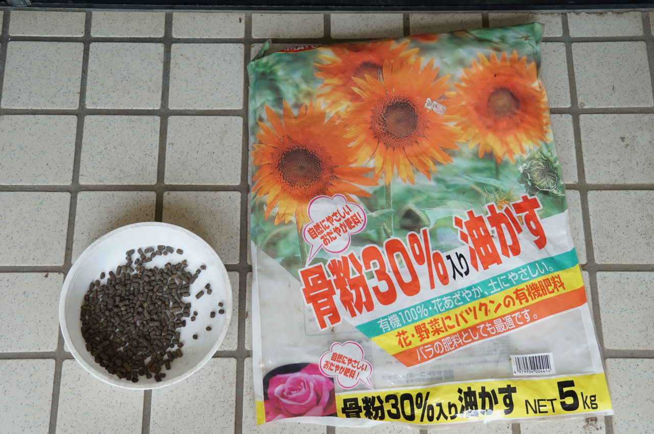 バラ用に買いました。骨粉入り油粕。油粕は虫が出たり臭いがあります。室内で育てる時は、臭いの少ないラン用の化成肥料を使います。