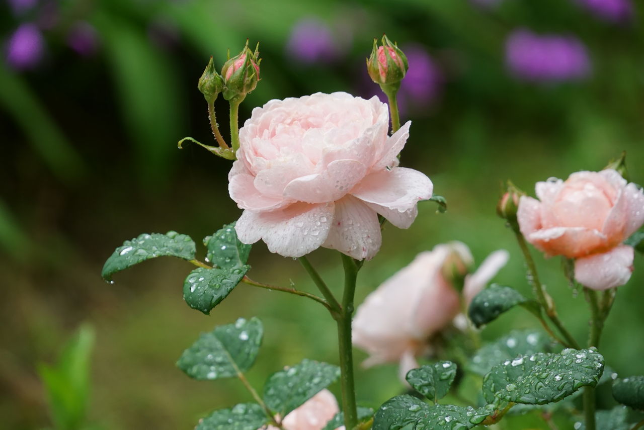 sony a6000 photo by Yasunosukey夜中、ヘッドライトに照らされたクイーンオブスエーデン(イングリッシュローズ)の葉の上の水玉がとてもとても美しくキラキラとして幻想的でした。それから、首をまわしてあたりの景色を見ると、水玉がヘッドライトが揺れるたびキラキラしていました。花の美しさも、葉の輝きも、水玉のキラキラも、花を育てていればのご褒美なんですね・・・やったぁーー