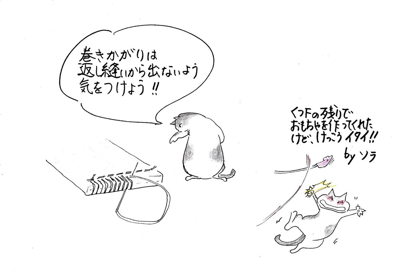 ※靴下の入り口が二重になっていないものは、端を内側に折り曲げて細かくまつり縫いをし、輪にして紐通しを作ります。