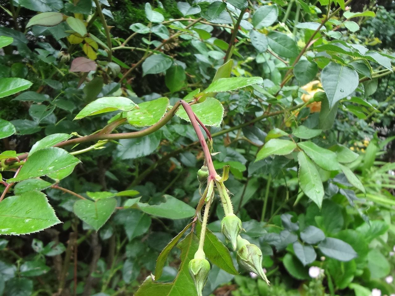 今朝、開いたばかりの花を摘むために庭に出ると、メアリーローズの2番花の蕾を持った新しい枝をかじられているのに気づきました。かじられたばかりの枝はみずみずしい部分があります。時間がたつと茶色になり、枯れたり、太い枝はそのまま生きることもあります。この枝は、残念ですが枯れてしまいます。良い芽の上で切り捨てます。
