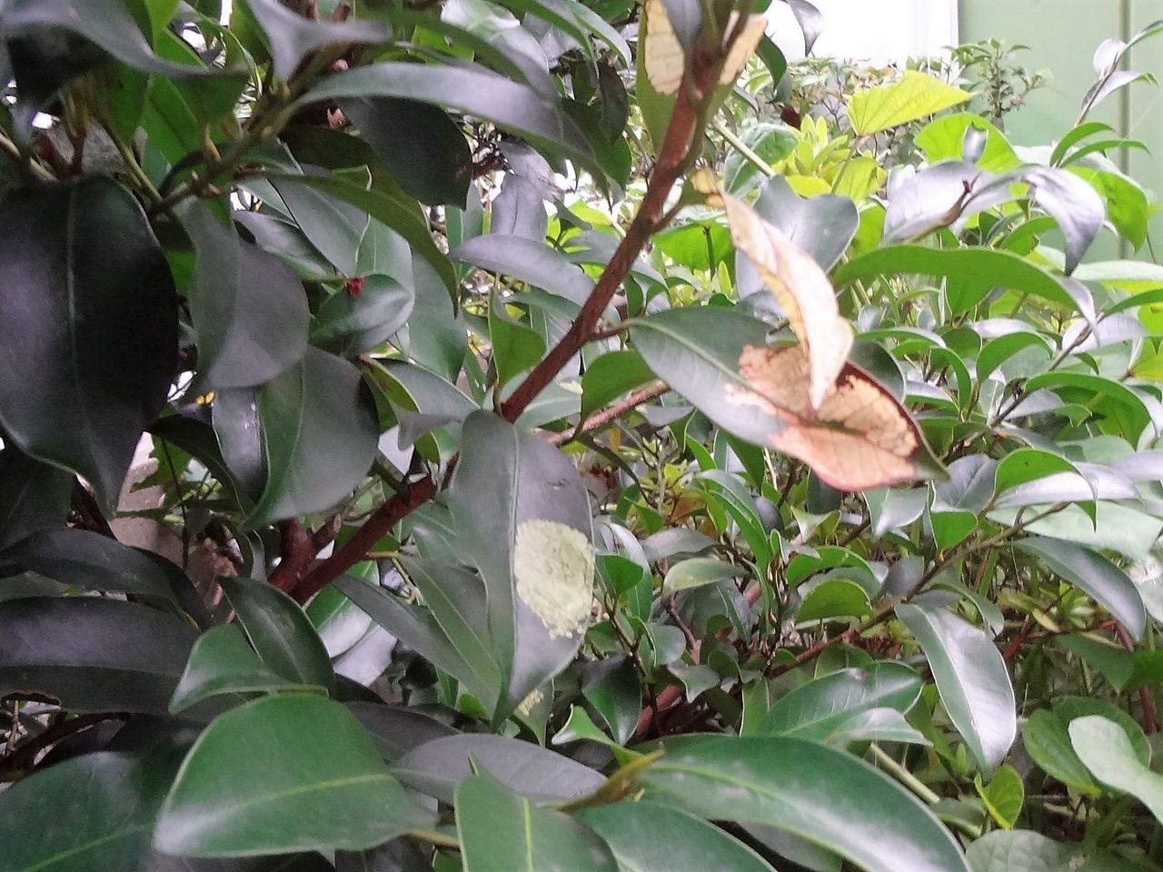 洗濯機を回しながら、庭に面した窓に椅子とカメラを用意して、あの蝶また来ないかな・・・と外を眺めていると、虫がつかないと思って15年間育てていた榊の葉に異変を見つけました。そう、イラガの赤ちゃんたちが大繁殖していたのです。