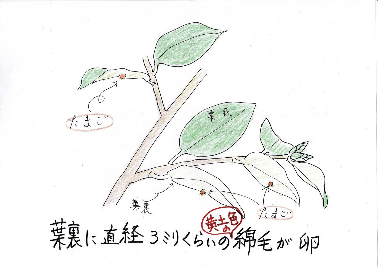 卵は6月と9月に椿類の葉の裏に産卵します。卵はベージュ色の毛でおおわれています。卵をおおう毛にも毒があります。産卵があった場合、枝ごと切り取って焼き捨てるか袋に入れて燃えるゴミに出します。