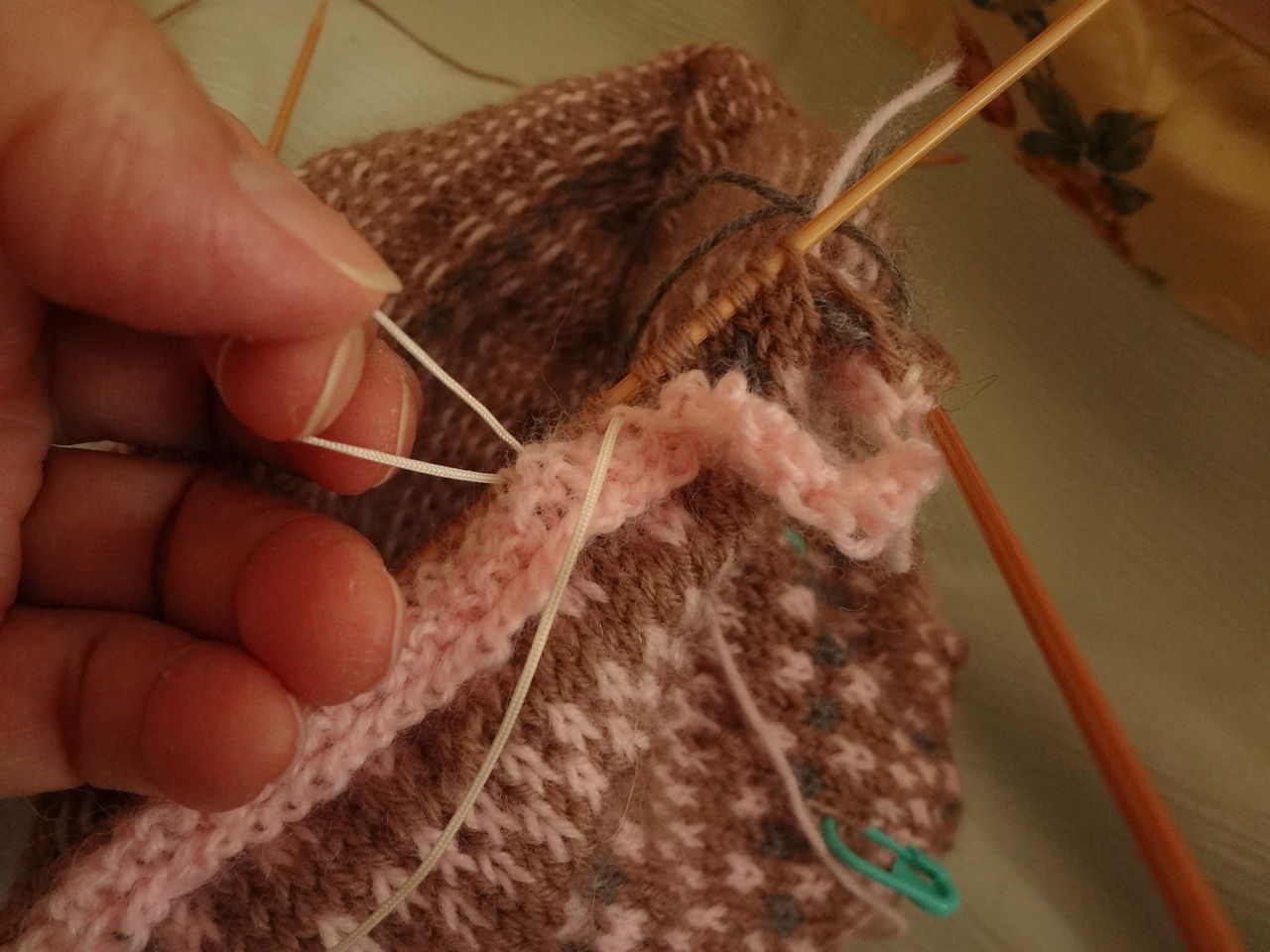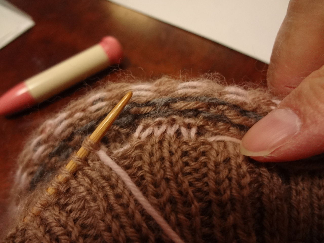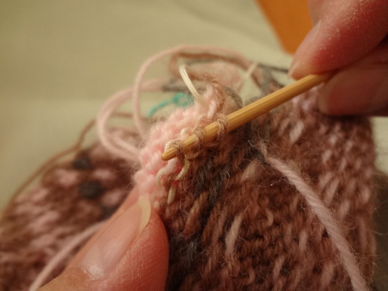 3段目のチャコールグレーの糸は地色茶色の糸に結んで模様を編み始め編み終わったら、最初の糸に結んで5㎝位残して切ります。次にピンクはグレーの糸に結んで編み始めます。このようにすると、始めて編む人も糸がズルズル抜けて編み目が大きくなるということもなく編むことが出来ます。