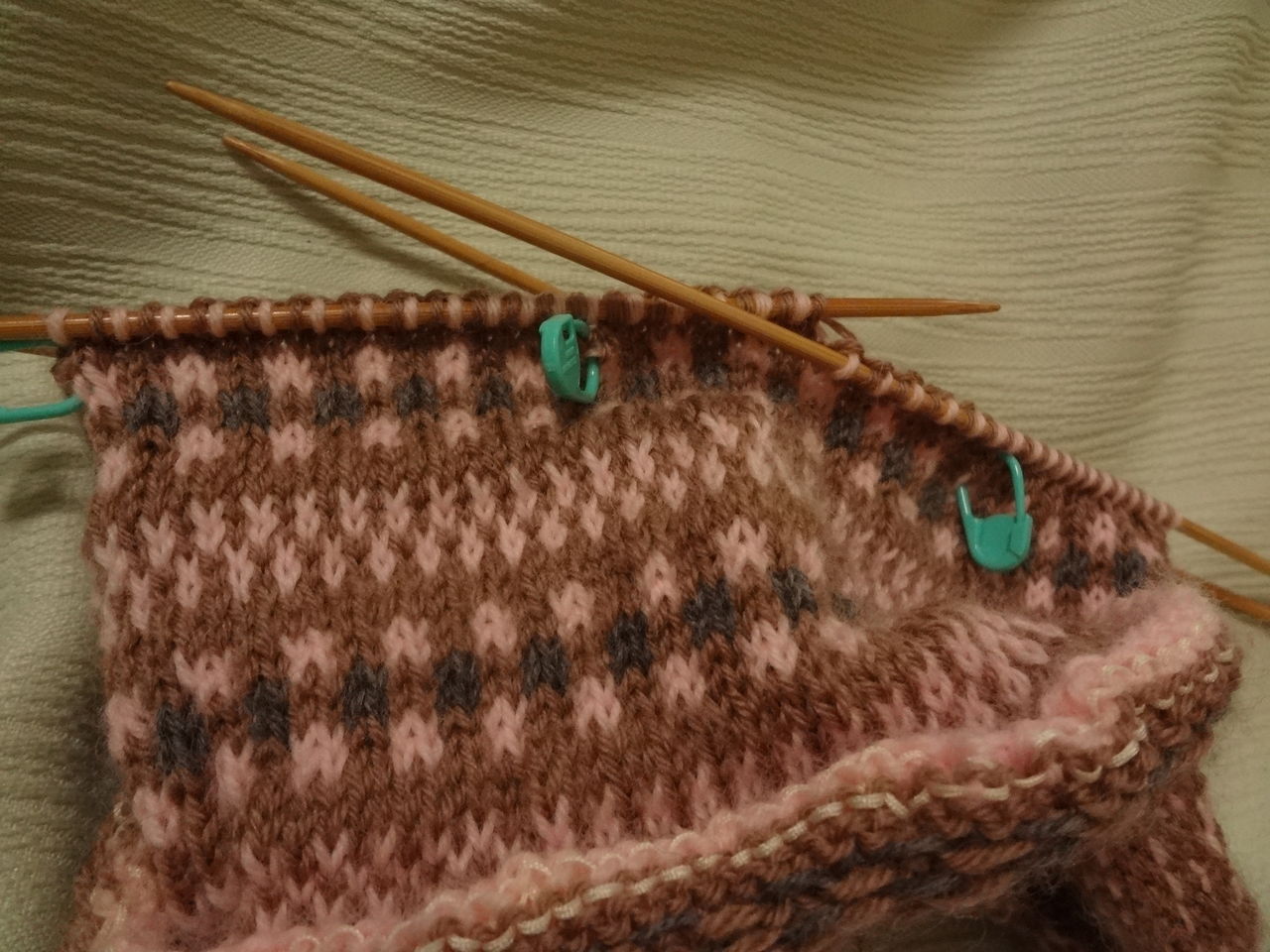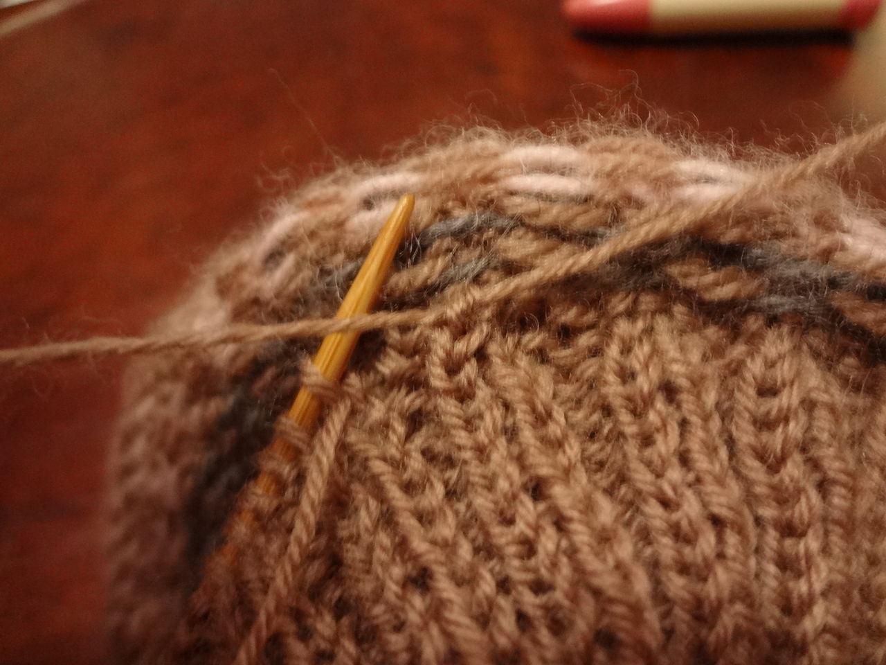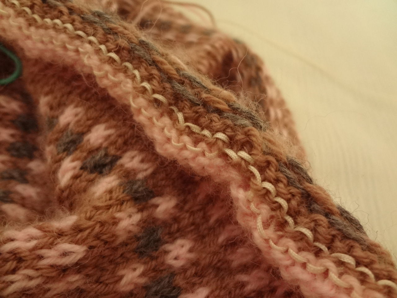 3段目のチャコールグレーの糸は地色茶色の糸に結んで模様を編み始め編み終わったら、最初の糸に結んで5㎝位残して切ります。次にピンクはグレーの糸に結んで編み始めます。このようにすると、始めて編む人も糸がズルズル抜けて編み目が大きくなるということもなく編むことが出来ます。