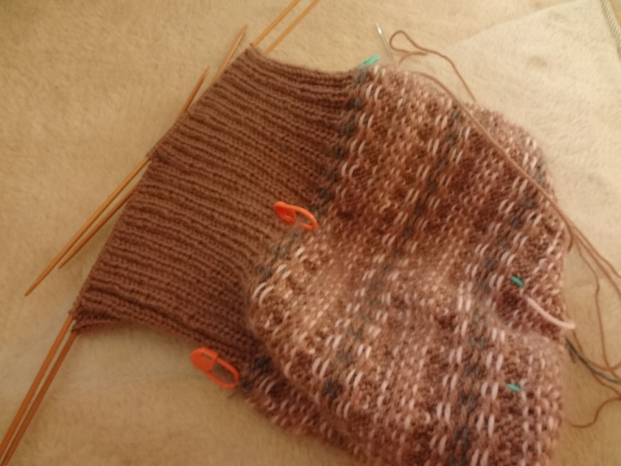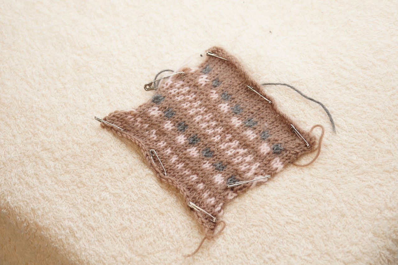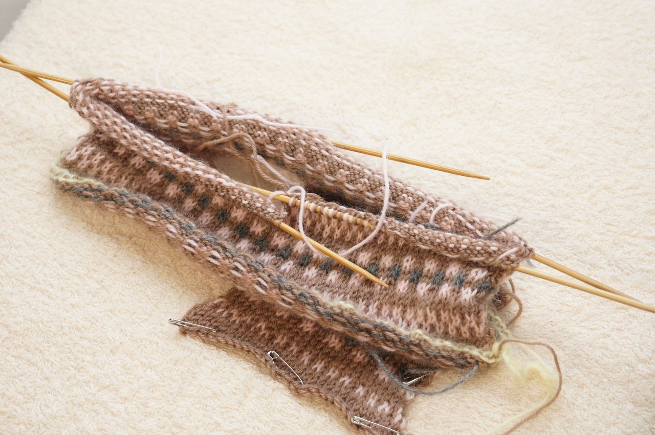 模様が沢山あって難しそうですが、実は全部メリヤス編みで、表の模様だけ見て編めばよいので、簡単です。編地も二目ずつ色を変えているので糸を休ませるときも均一になり出来上がりが一定になりやすいです。しかも、2段ずつ糸を変えているので、段数マーカーなしでも段数が数えやすいです。