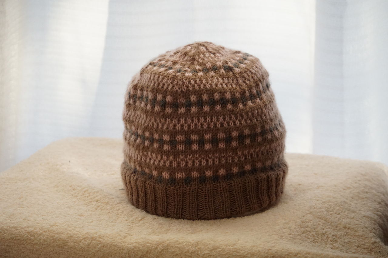 ▲これが裏側の編地。どうです、均一になっていますね。特別な技術や経験がなくても編むことが出来る帽子です。しかも、1週間で編めてしまいます。