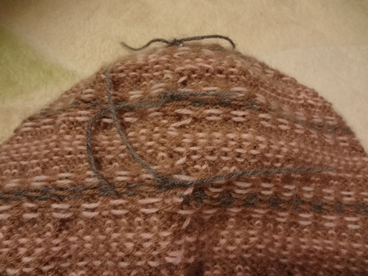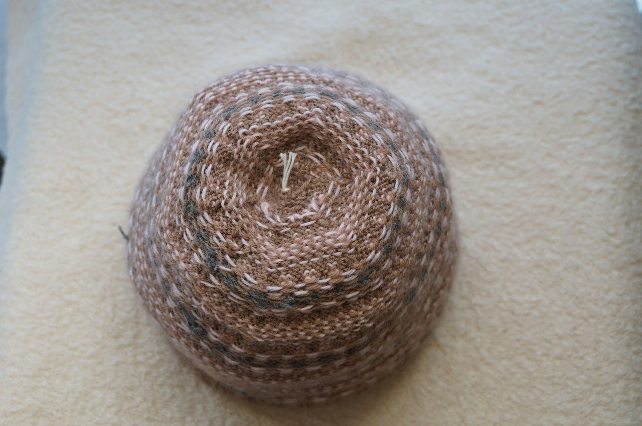 ▲帽子の裏側です。タコ糸を引き締めて3度固結びをしてきりまた。編み糸のピンクも茶色も一度裏に結んで編地の後ろ側に針で巻き込んで処理しました。
