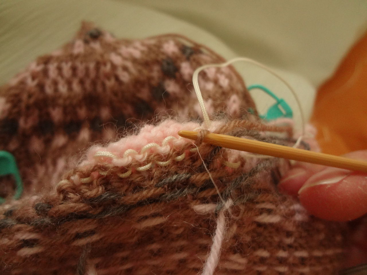 ▲ピンクで6段ほど編んだのが下編み、クリーム色が抜き糸で、1段だけ編んでいます。