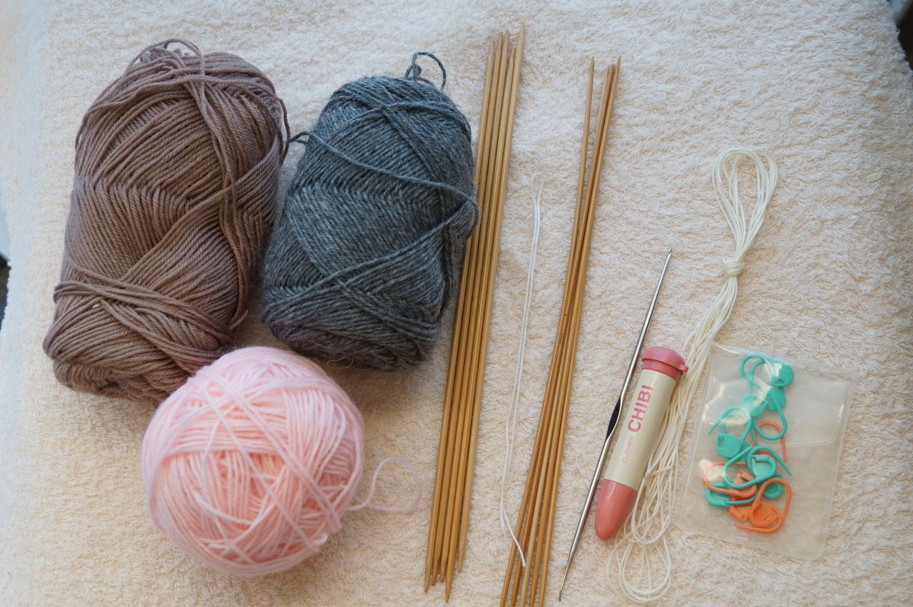 左から・・・中細毛糸(茶1個、チャコールグレー、ピンク)、棒針3号5本、1号5本、タコ糸約30㎝、かぎ針3号、とじ針中細用、編み機などの抜き糸3.5m、マーカー