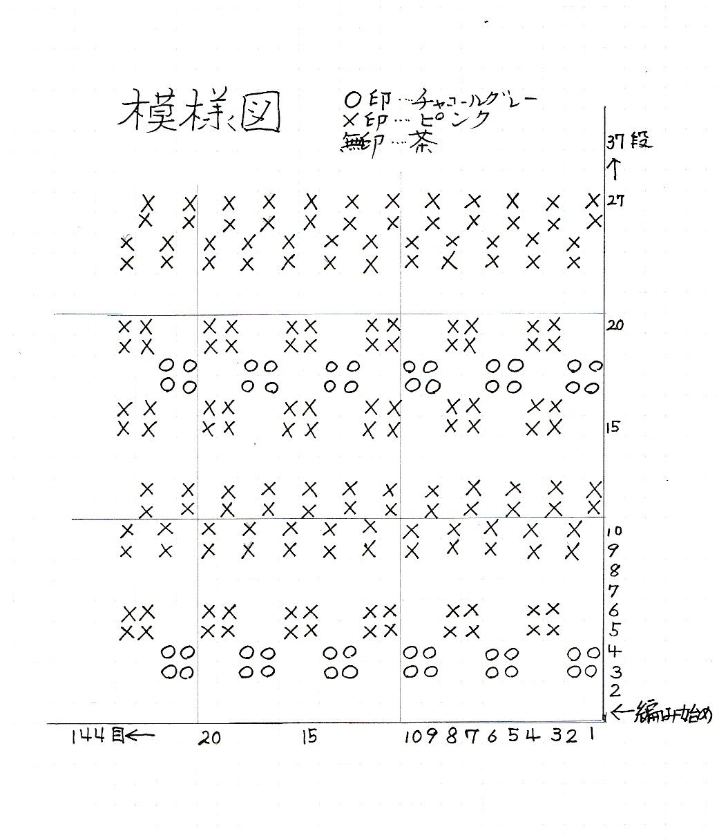 ▲編み模様です。〇印がチャコールグレー、×印がピンク、何も印が無い所は茶色の毛糸です。
