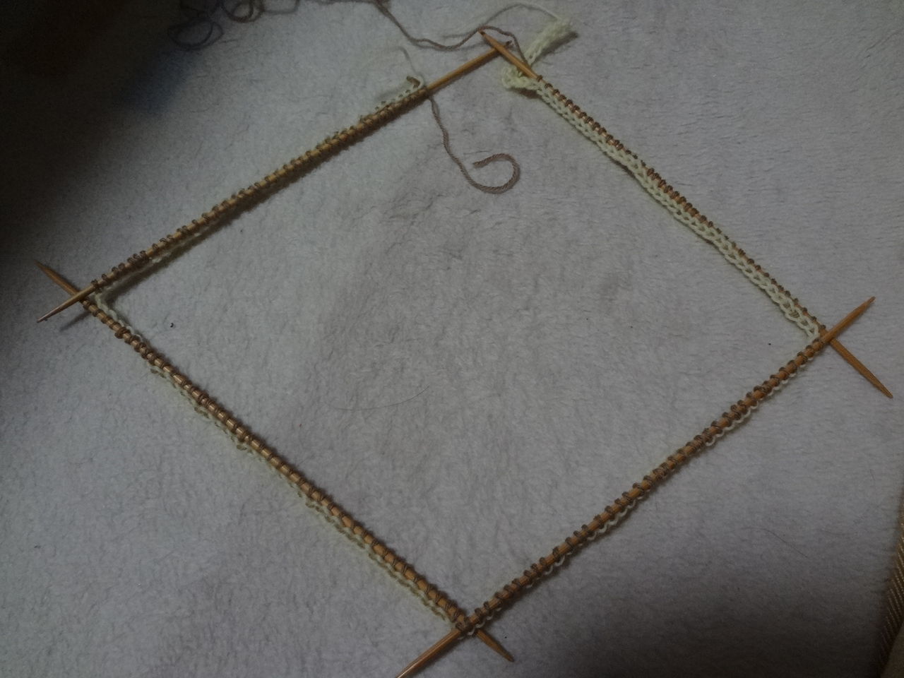 最初は、手が慣れていなくて、しかも単純ミスで目数を16目オーバーで編んでしまい、腹巻みたいになってしまいました。このままスヌードもありかと思いましたが、帽子が欲しかったので、