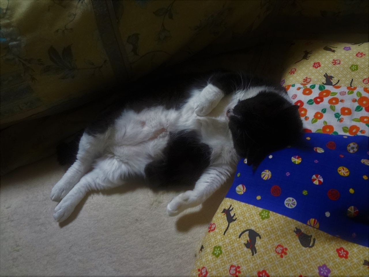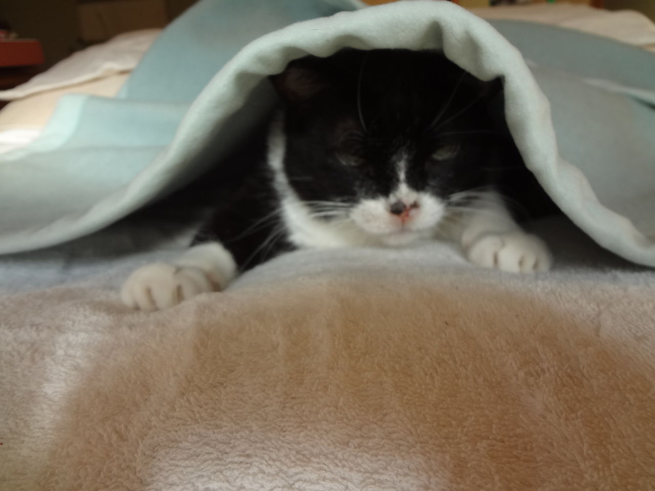 ソラのベッドは、二枚重ねの毛布を二枚折ってその下に湯たんぽを入れて温かくしてあります。温度が上がり過ぎではないかと思い、薄い掛布団を湯たんぽとソラの間に1枚入れ、ソラの体に当たる部分の温度が上がりすぎないようにしました。