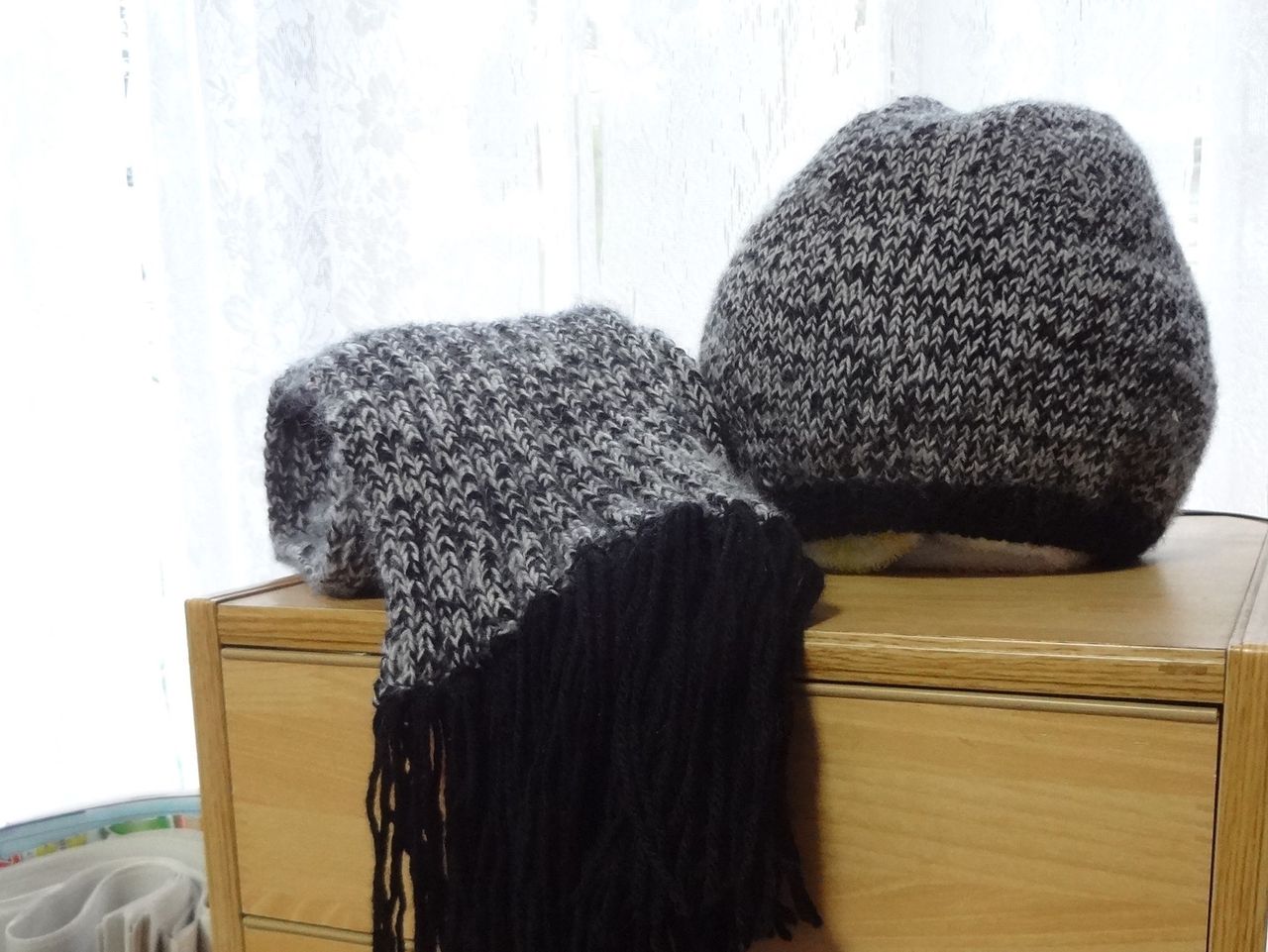 糸が余ったので、マフラーと帽子も作りました。ライトグレーの糸と黒糸の二本取りでゆったり編みました。柔らかくて暖かく肌触りも良く、暑すぎず体温をキープしてくれので気に入っています。