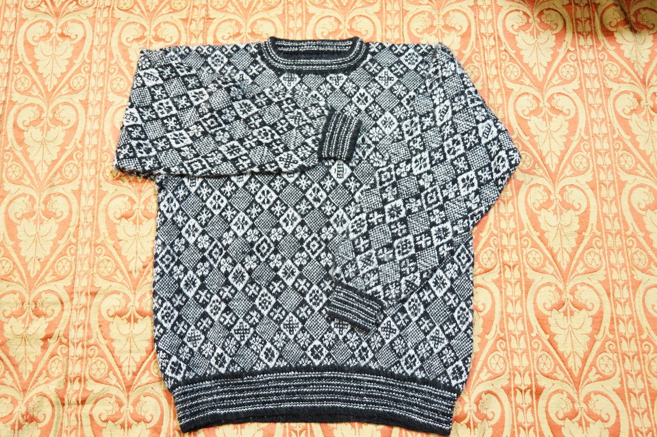 本屋さんでこの本を見つけた時にはぜひ一度は編み込みのセーターを編んでみたいと思い、テキストを買って、毛糸を探しましたが、残念なことに、私の行動範囲では毛糸が見つからず、妹に頼んで、ライトグレーと黒の毛糸をたくさん買って送ってもらって編みました。作ることが一段と楽しいと思わせる一品でした。