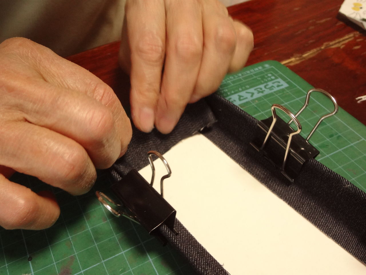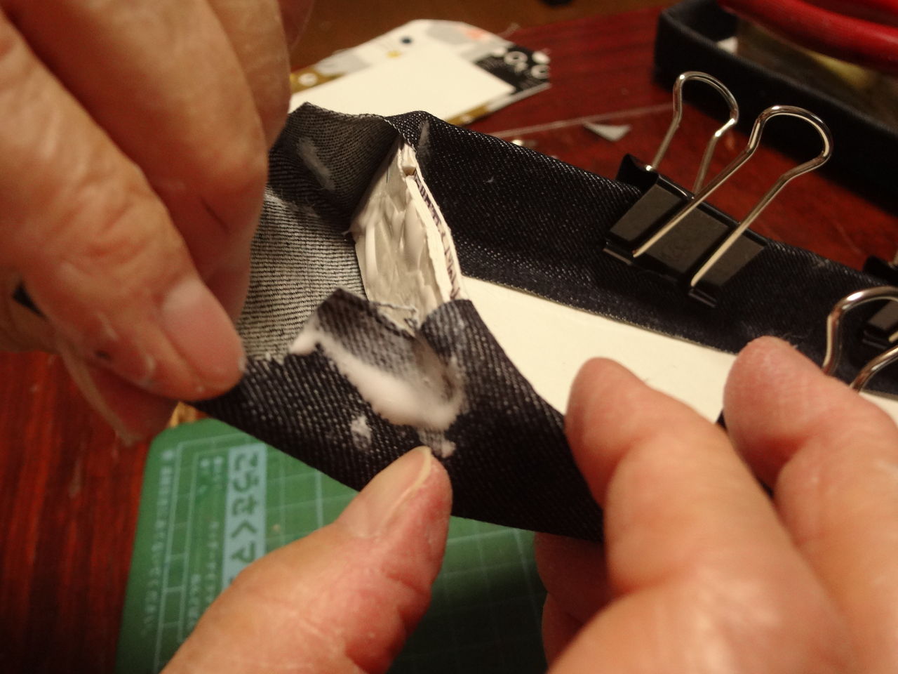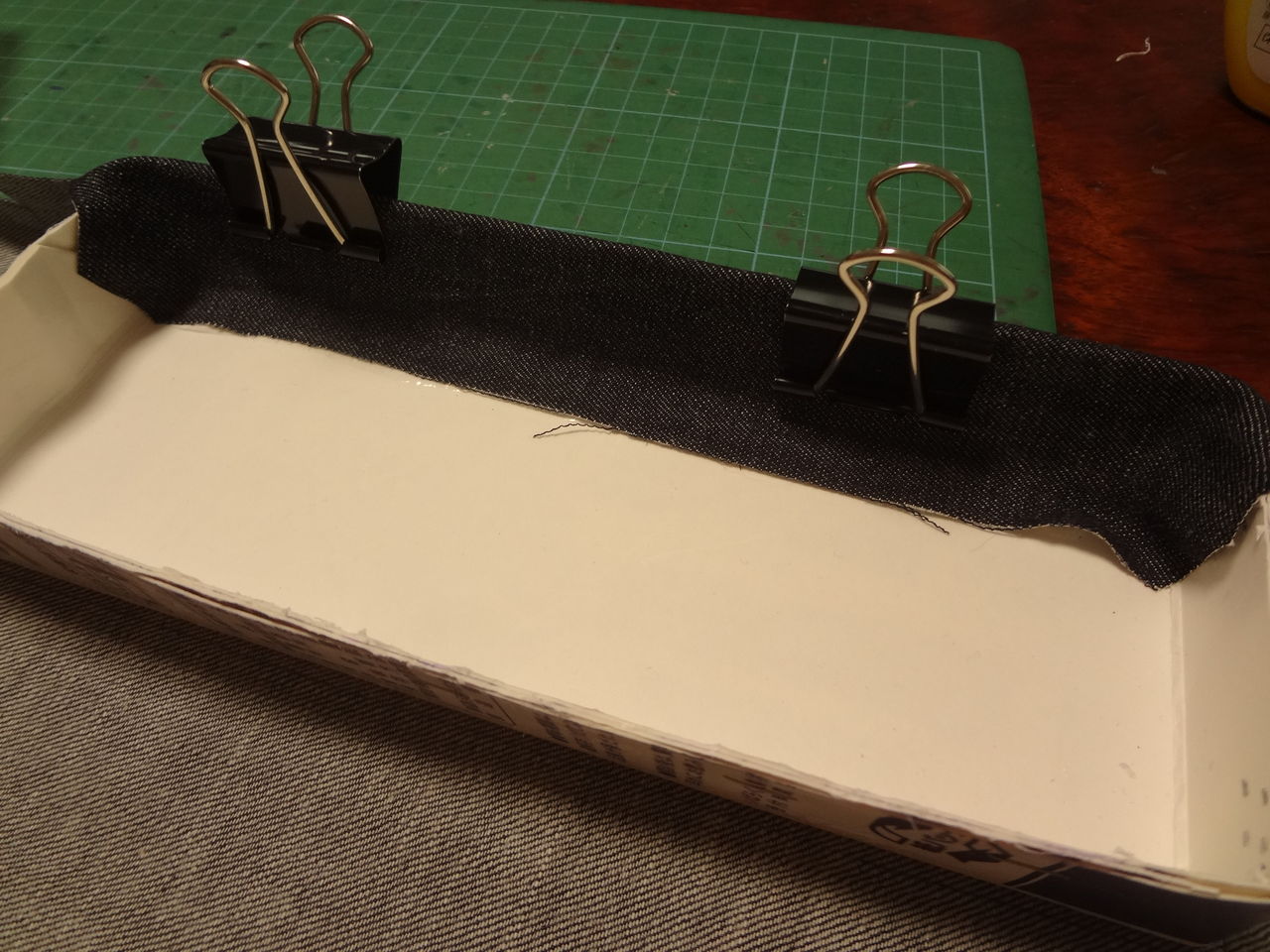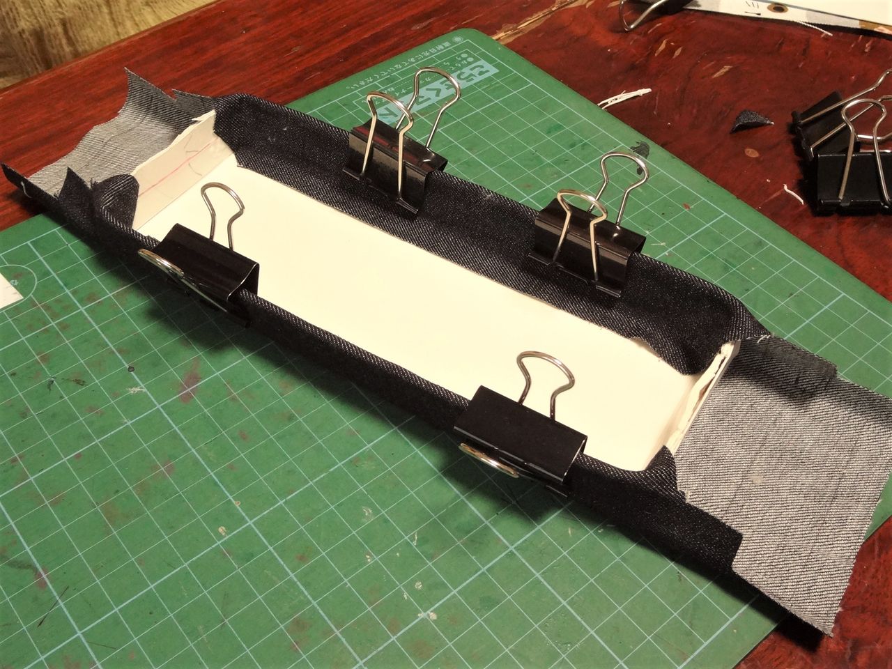 次は底板に布を張る作業です。その作業の間、クリップで止めておきます。