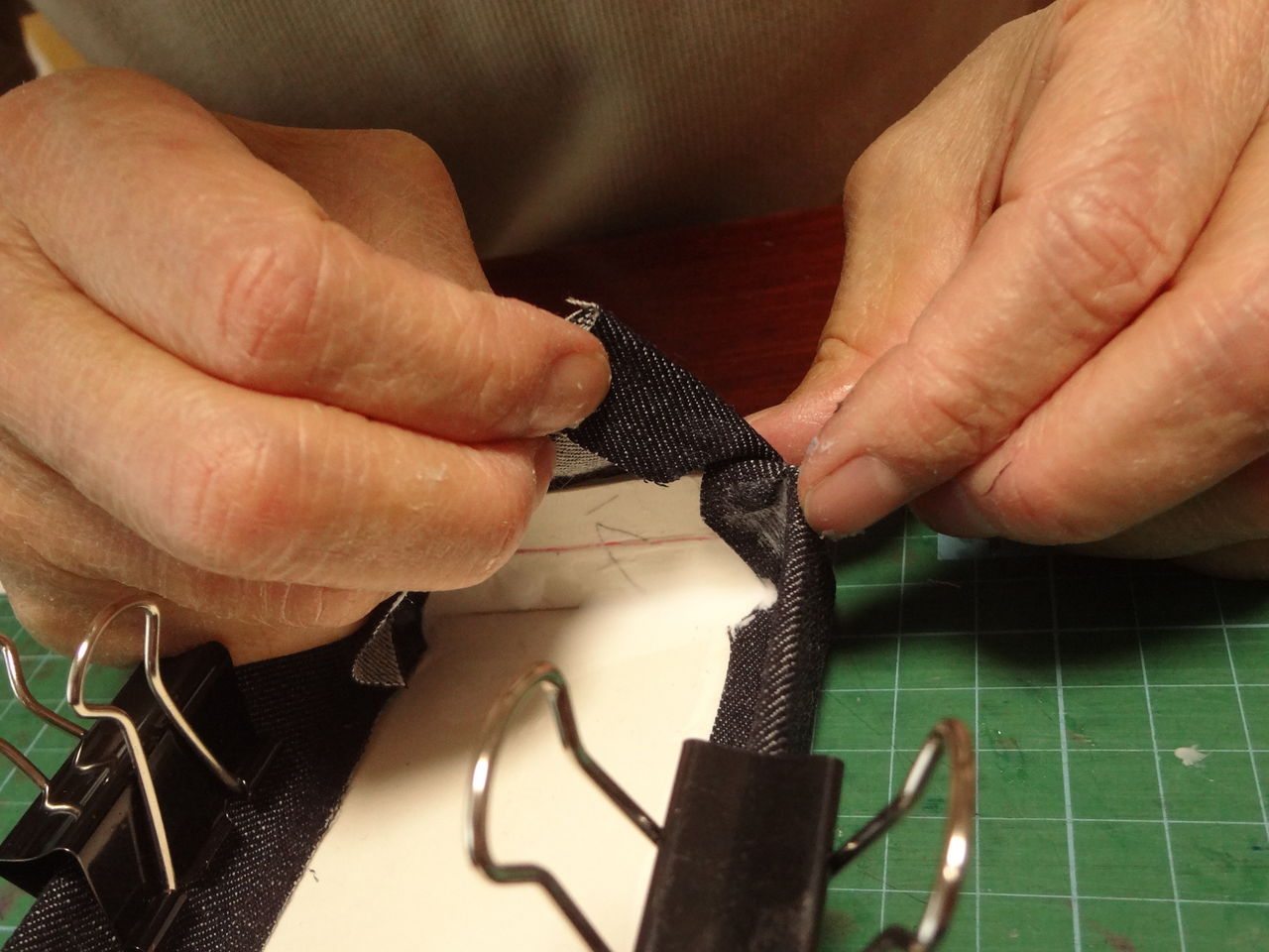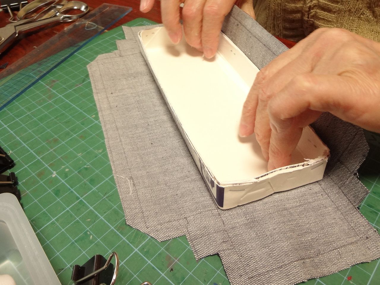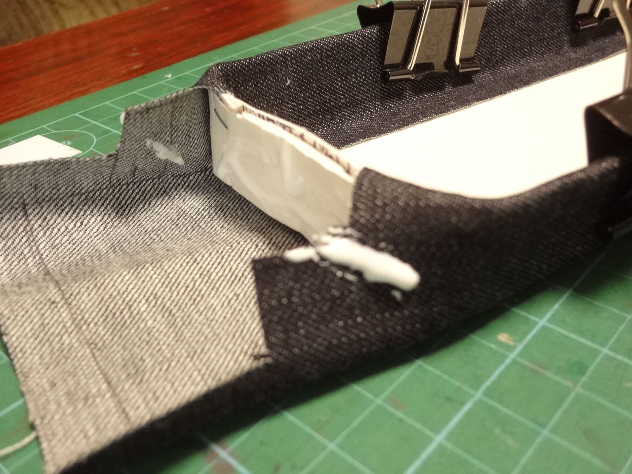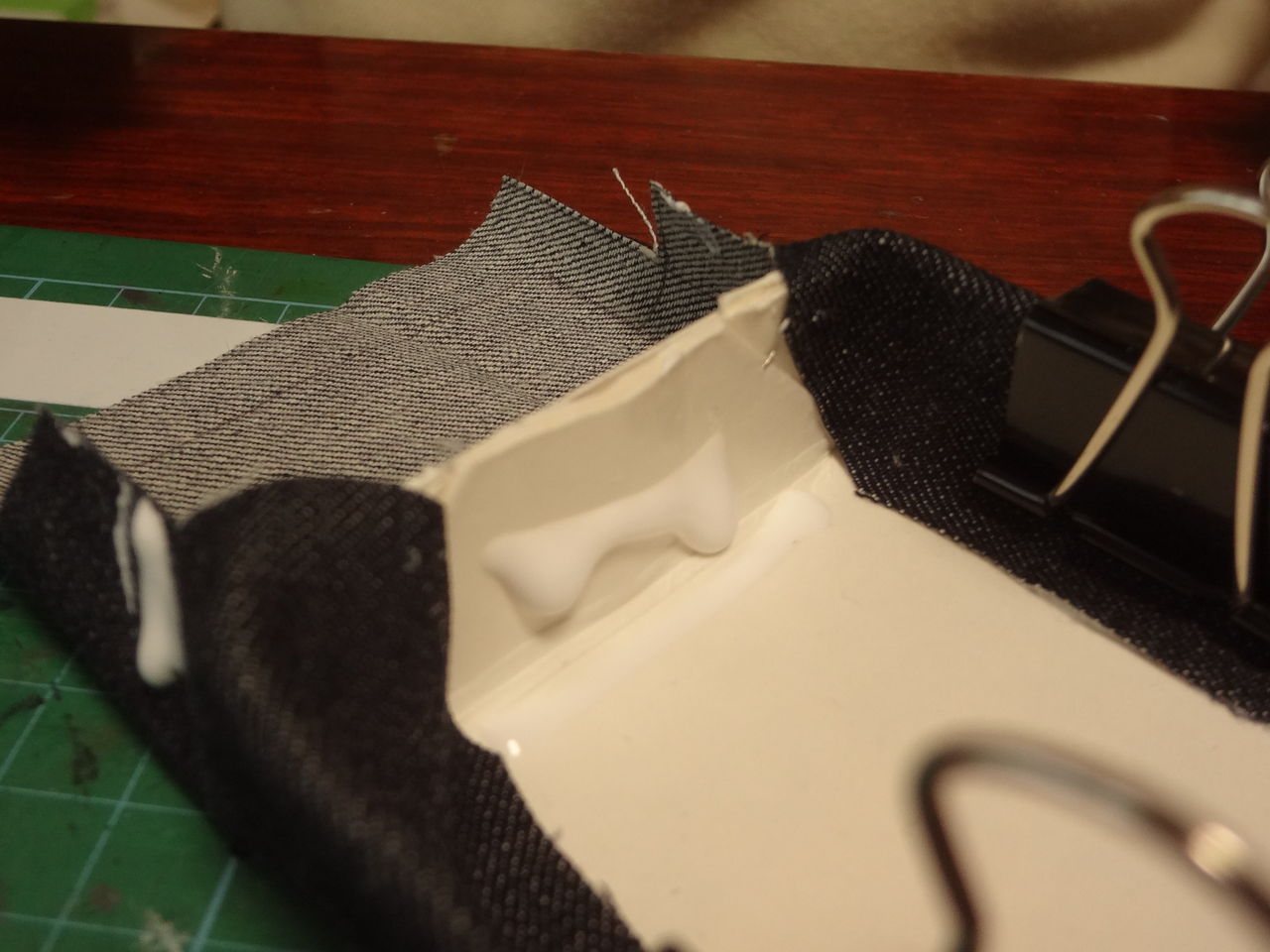 次は底板に布を張る作業です。その作業の間、クリップで止めておきます。