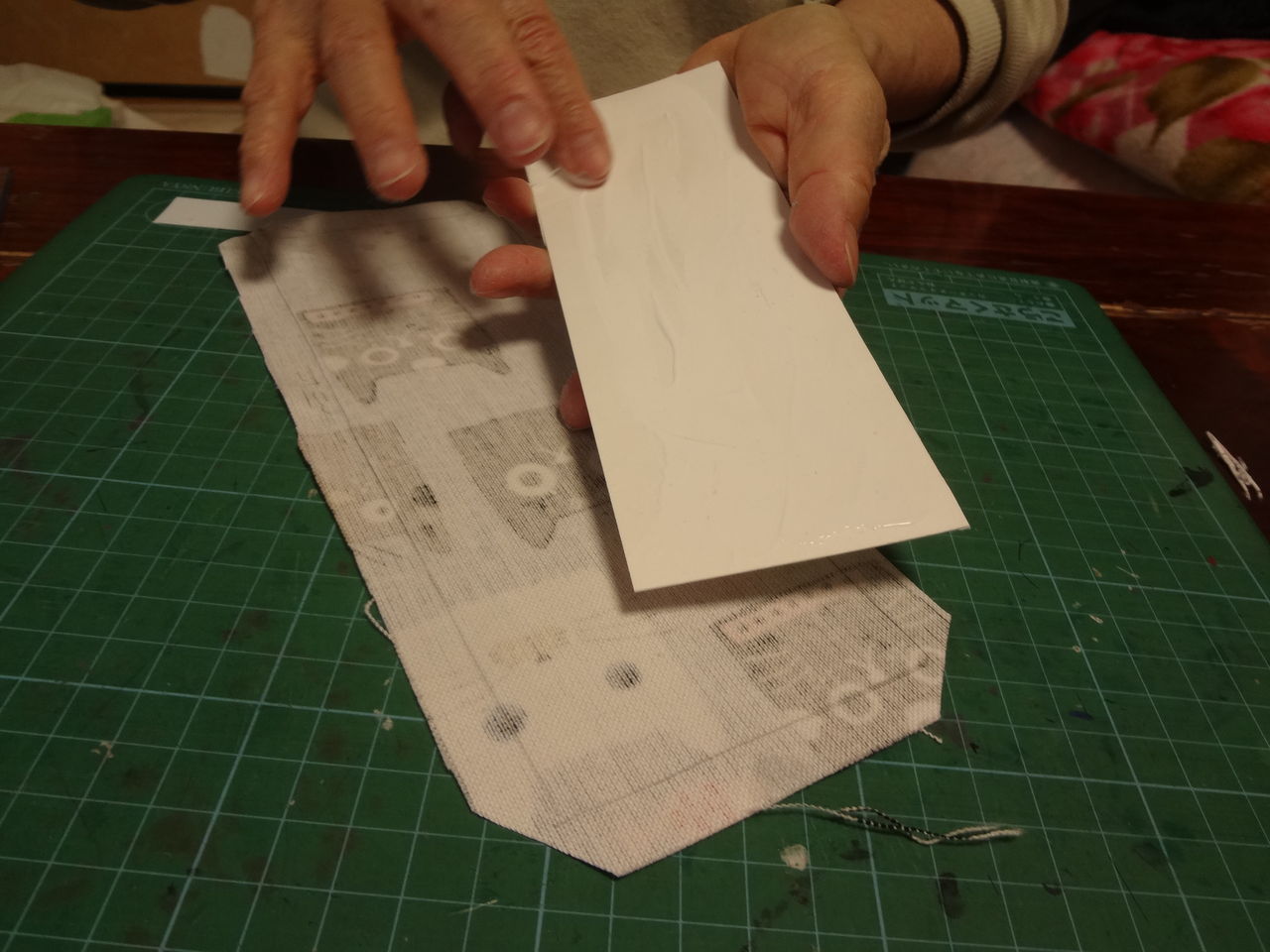 最初に長い方の辺を、側面内側と外側にボンドを塗り、布は引っ張らず持ち上げるようにしてしわが寄らないようにはります。つい布をビシッと貼りたくなりますが、引っぱってはると、模様があるものは、ボンドで濡れてふやける分、模様のゆがみが出やすくなります。