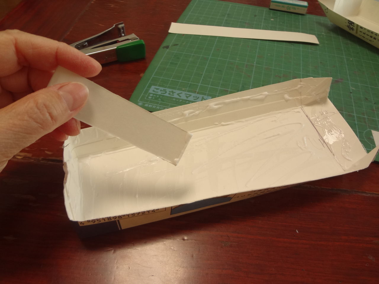 切り取り作業で出た2㎝幅くらいの牛乳パックの紙を半分に折ってヘラ代わりにすると、薄くまんべんなくぬれます。
