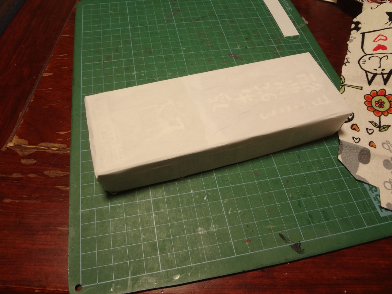 布は、まず四角い型紙で四角を描いて、そこにのりしろ付きの型紙を当て線を引きます。四角い線は、箱を中央に間違いなく置くための目印になります。模様のあるものは模様が斜めにならないようにするためにも特にこの印は必要です。