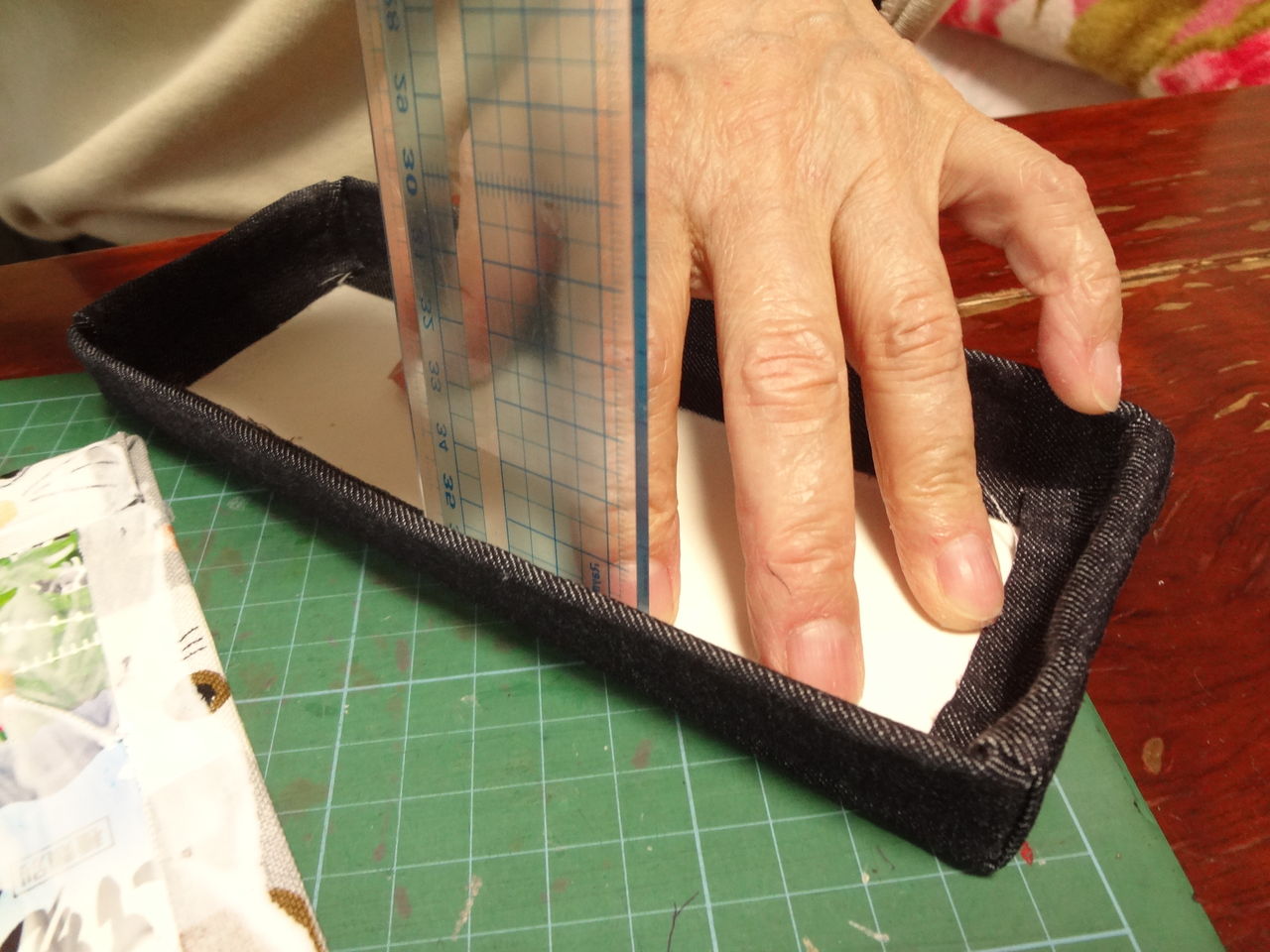 内側に折った後に、内側の布をもう一度持ち上げて、底板からはみ出ないように、箱の上側の角を抑えながらやや内側に折りながらはり直します。