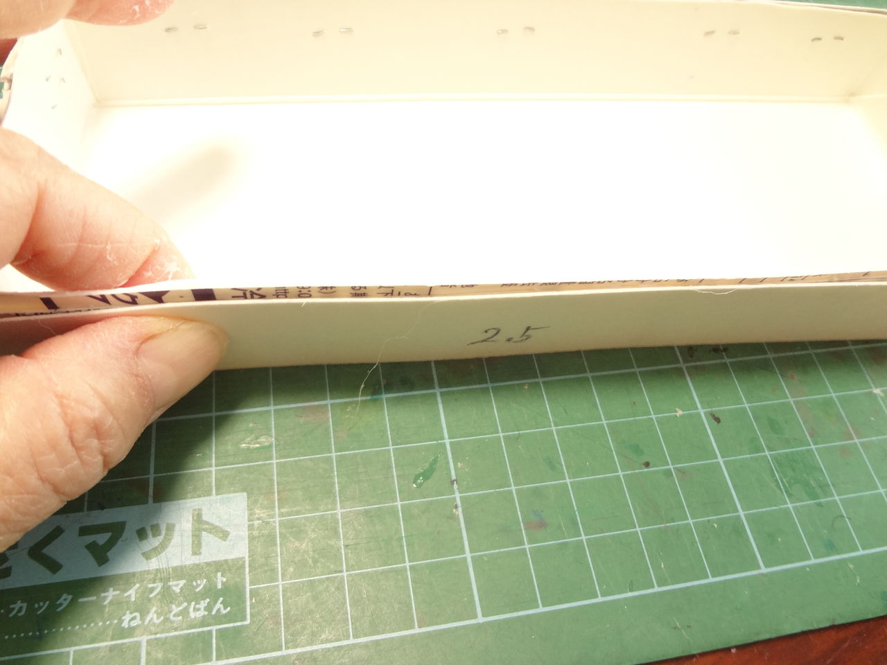 ホチキスで止めた後、2.5cmの厚紙を当てて確認します。飛び出した部分は、カッターで切り落とし整えます。